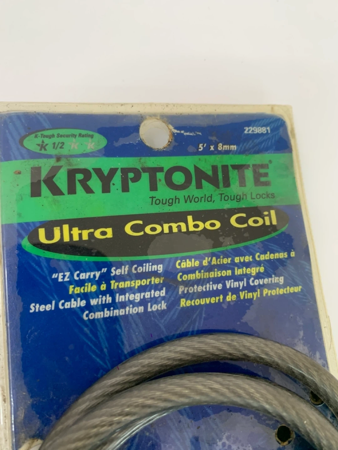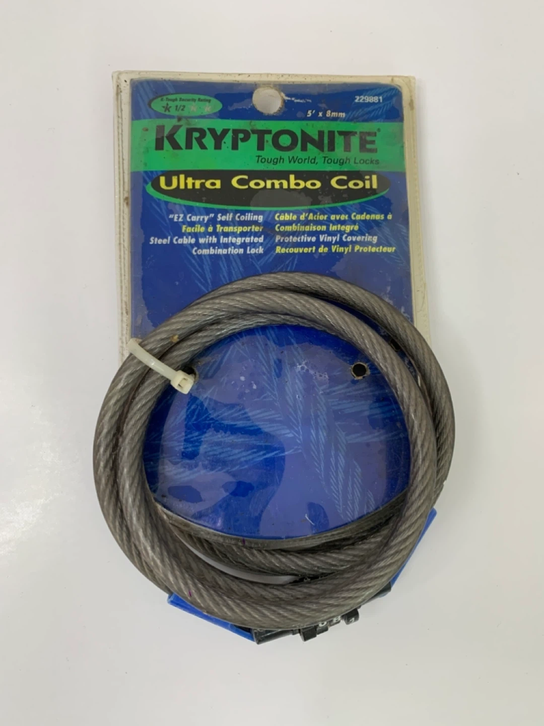 This is a Kryptonite Ultra Combo Coil cable lock. It's a 5' x 8mm steel cable with an integrated combination lock. It features "EZ Carry" self coiling and protective vinyl covering. This lock's coiled design makes it easy to store and transport. It's great for securing bikes or other gear!