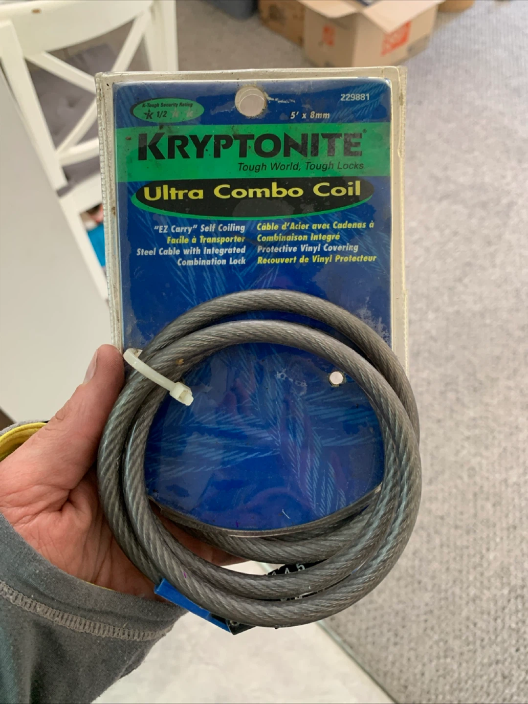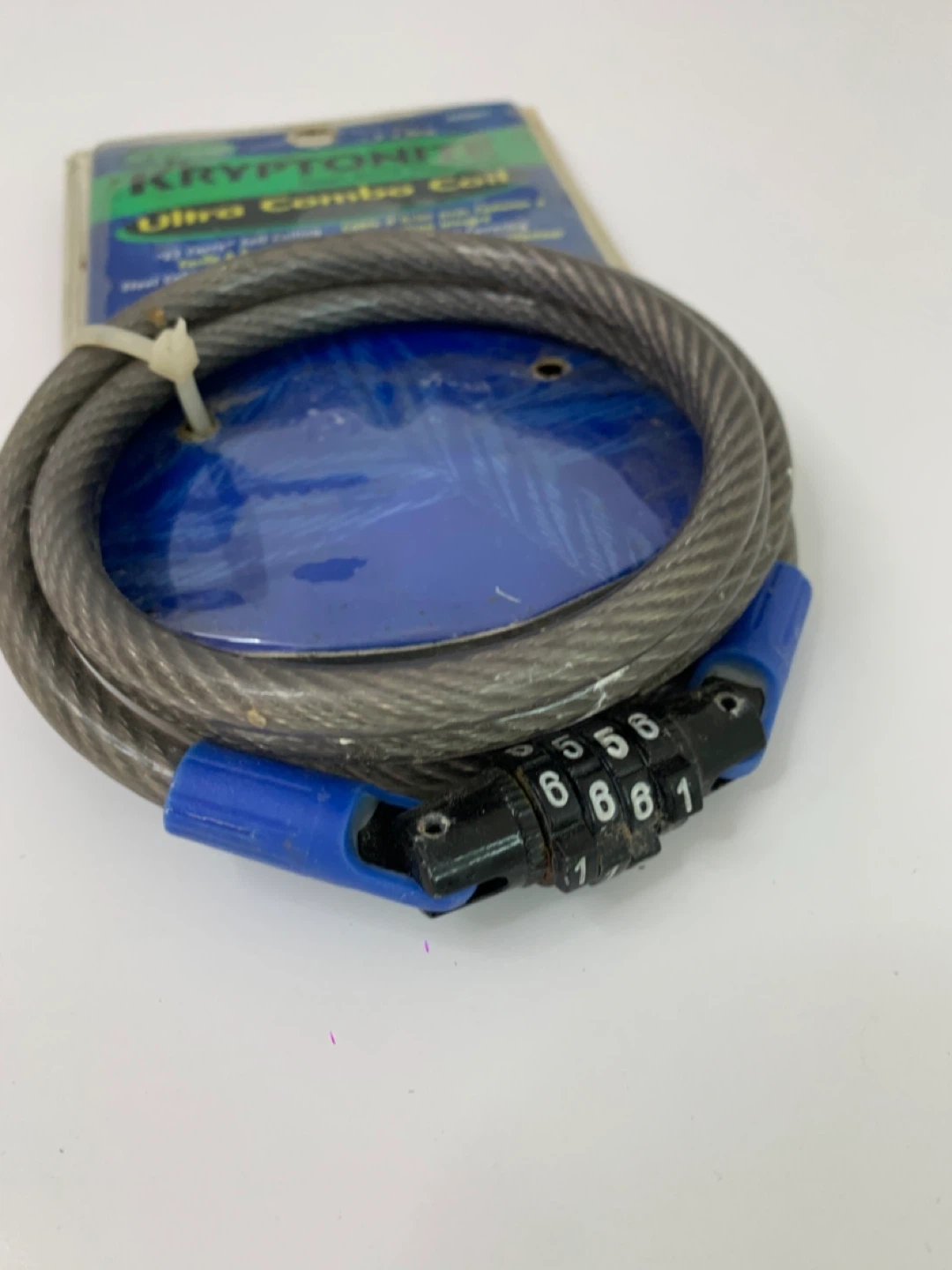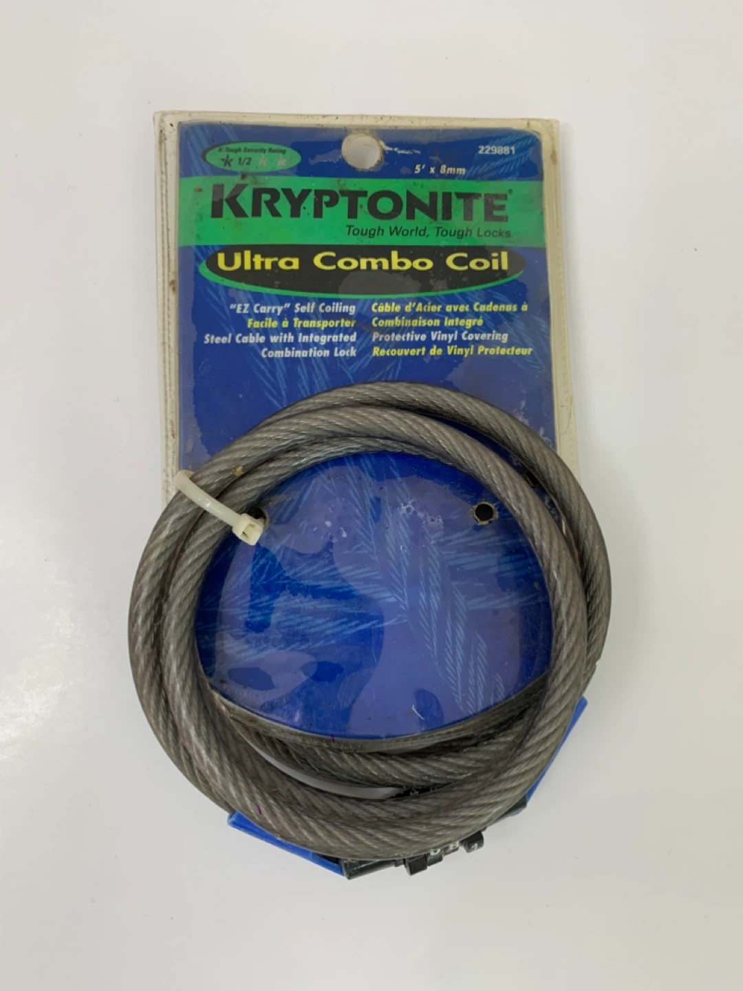 This is a Kryptonite Ultra Combo Coil cable lock. It's a 5' x 8mm steel cable with an integrated combination lock. It features "EZ Carry" self coiling and protective vinyl covering. This lock's coiled design makes it easy to store and transport. It's great for securing bikes or other gear!