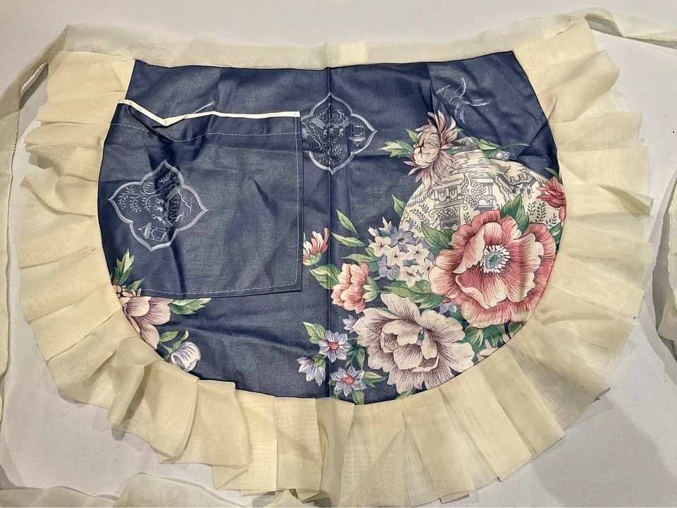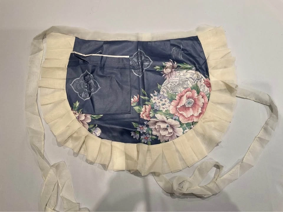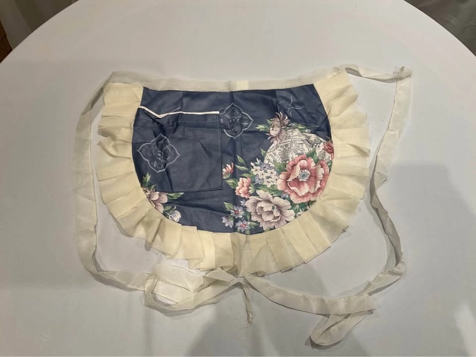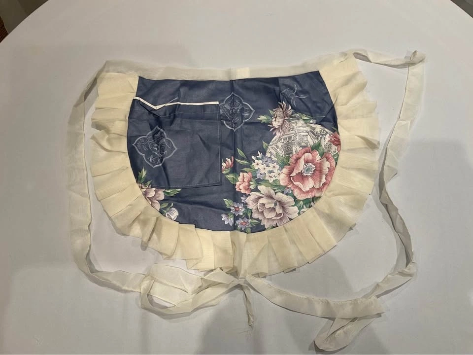 Charming vintage apron with a pretty floral design. It has cream ruffled trim all around the edge and a handy front pocket. Great for cooking or just adding a cute touch to your outfit. Smoke-free, pet-free home.