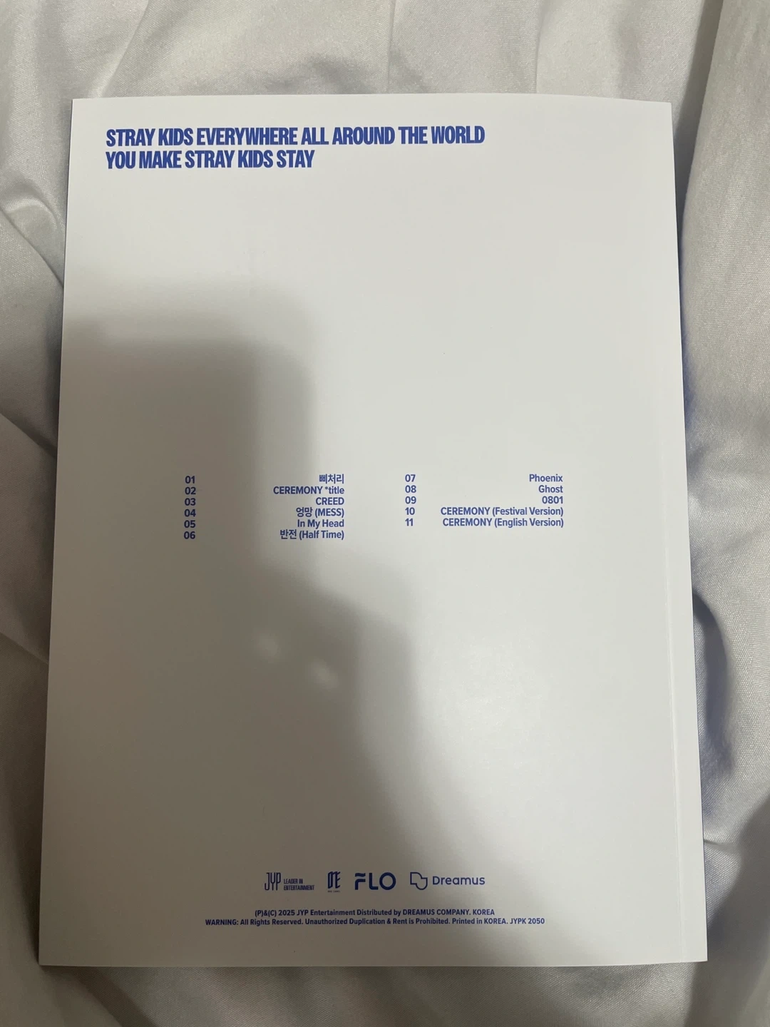 Stray kids 100 page KARMA photo book and CD! The cd and photobook are in perfect condition. CD Includes the songs: Ceremony, Bleep, Creed, Mess, In my head, Halftime, Phoenix, Ghost, 0801, Ceremony (festival version), Ceremony (English version) also comes with small posters of every member!