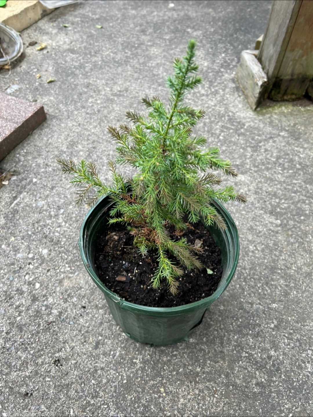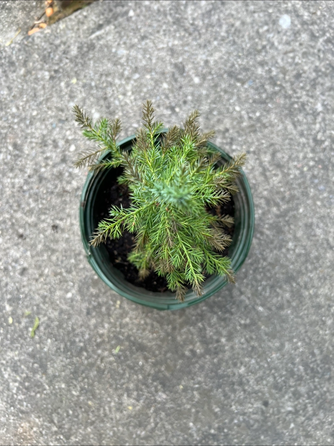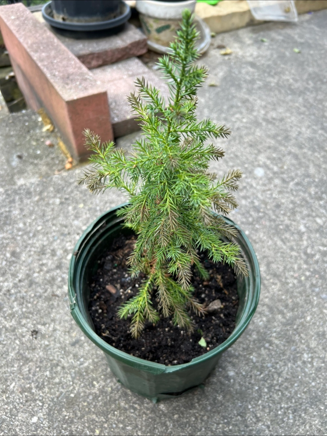 A small plant in a green plastic pot. The plant appears to be a young evergreen tree. Its green needles are growing upwards. This plant will add a touch of nature to your living space.