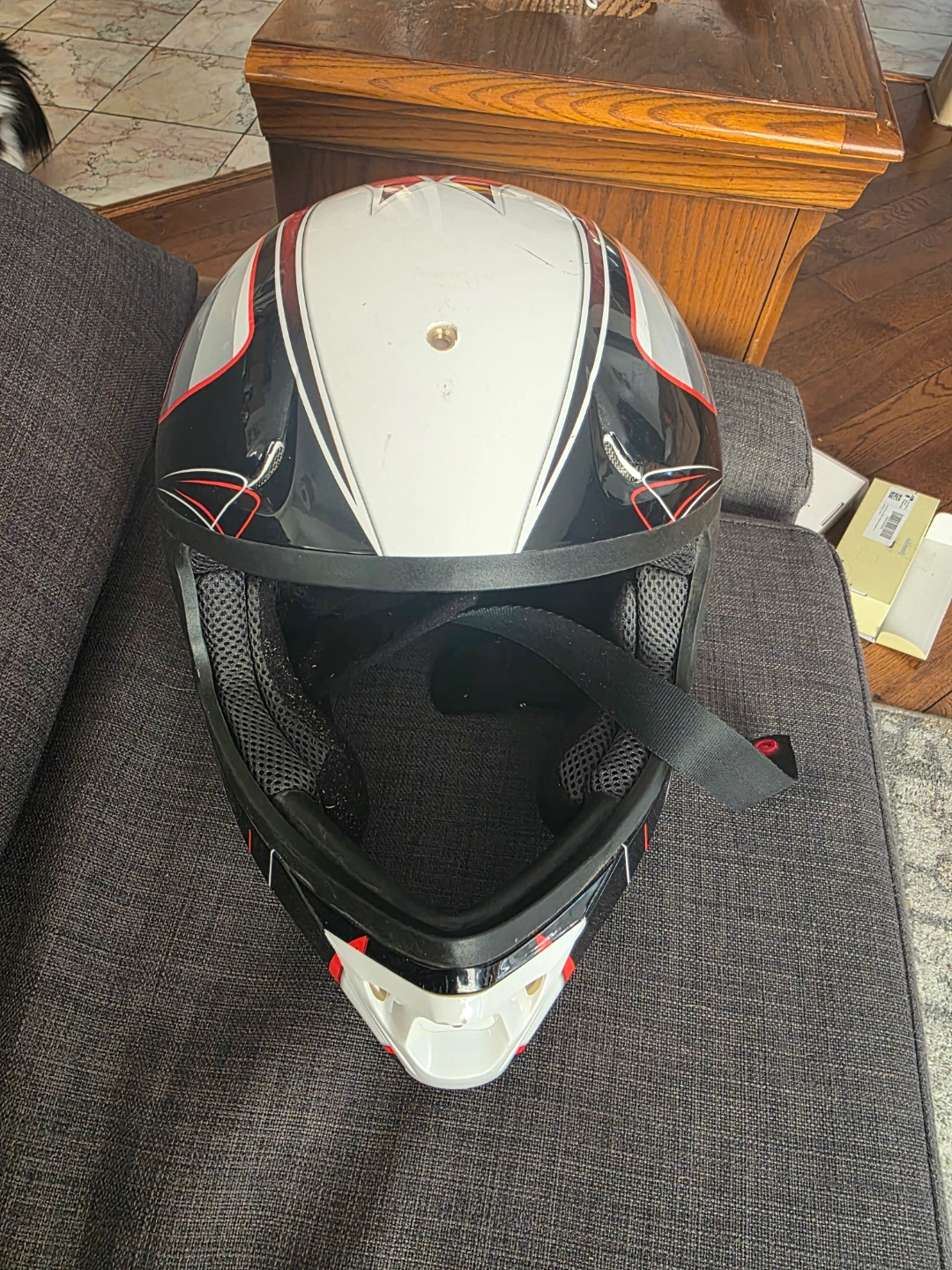 Black, white, and red motocross helmet. Features a chin guard and adjustable straps. Good used condition.