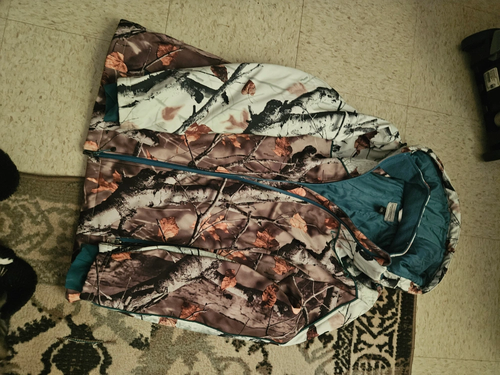 Show allWinter jacket, youth size large. Features a teal/turquoise lining and autumnal camouflage print. Full zip closure. Good condition.