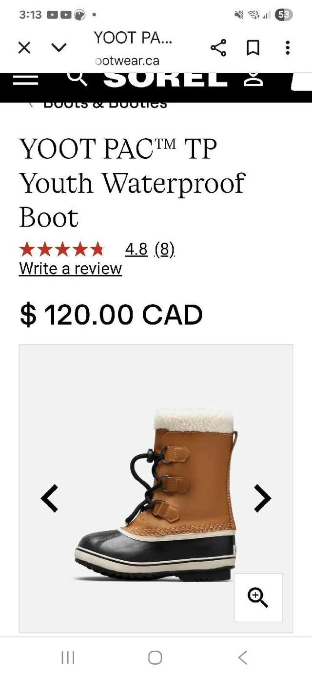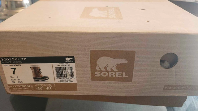 15Gently used Youth Size 7 - Sorel Winter Boots, Yoot Pac Style. $75.00 obo. Seam-sealed waterproof construction Removable 9 mm washable recycled felt inner boot with Sherpa Pile snow cuff 2.5 mm bonded felt frost plug midsole Handcrafted waterproof vulcanized rubber shell with Sorel aero-trac non-loading outsole Design Elements Leather Waterproof Felt Vulcanized Rubber