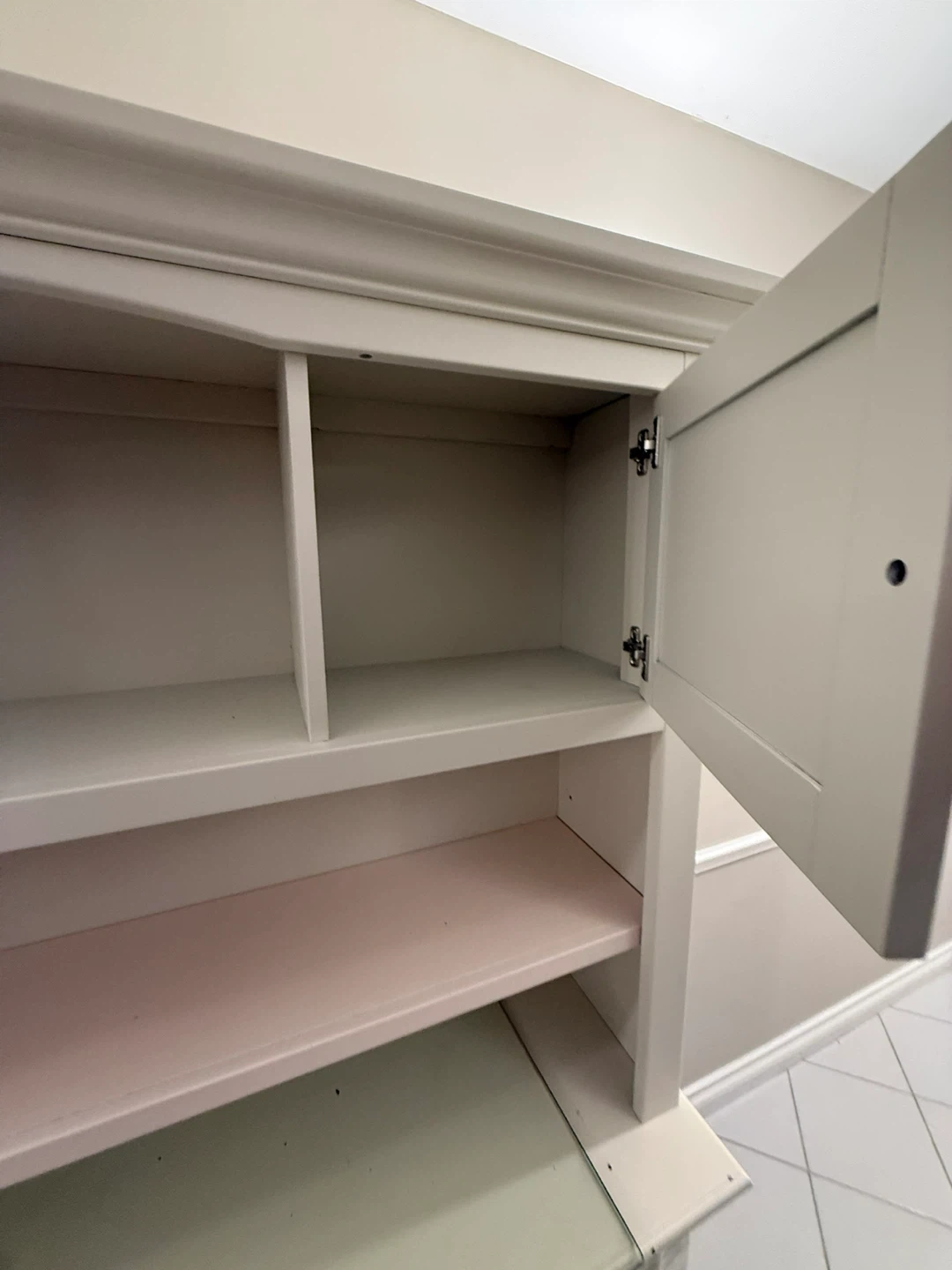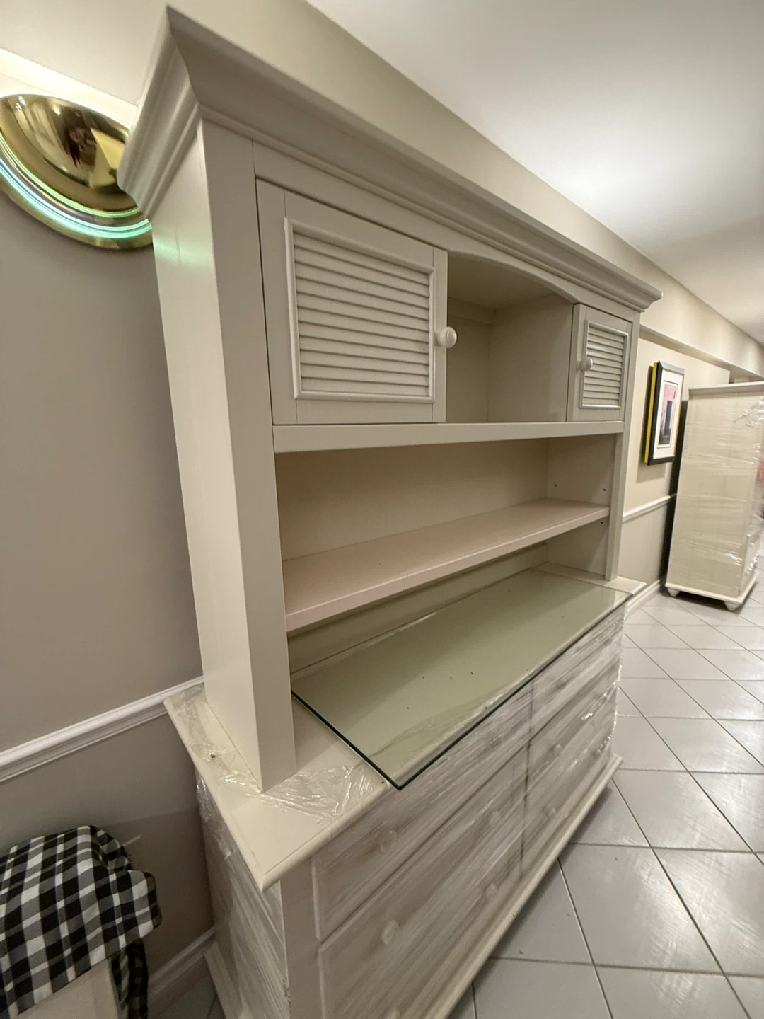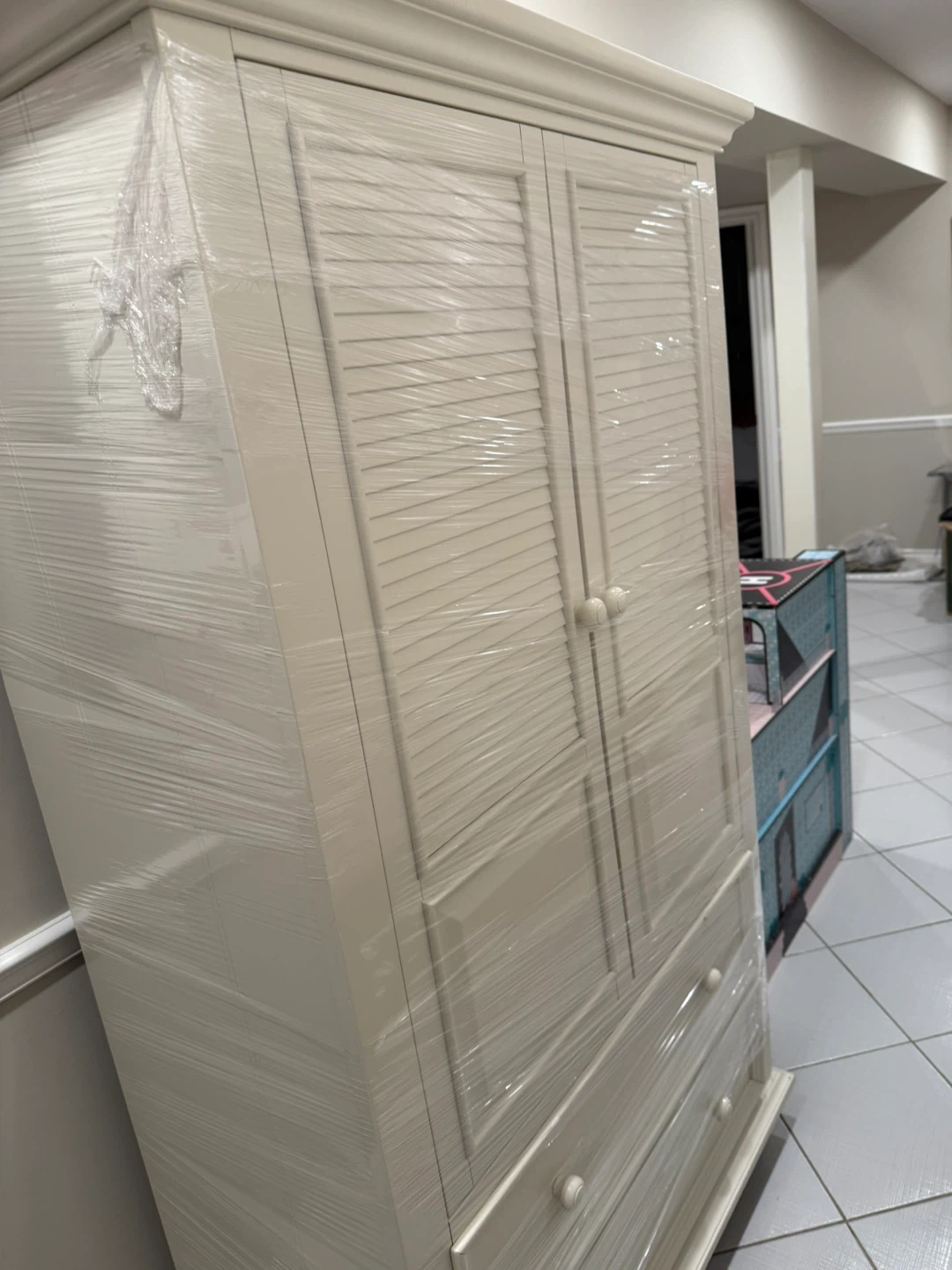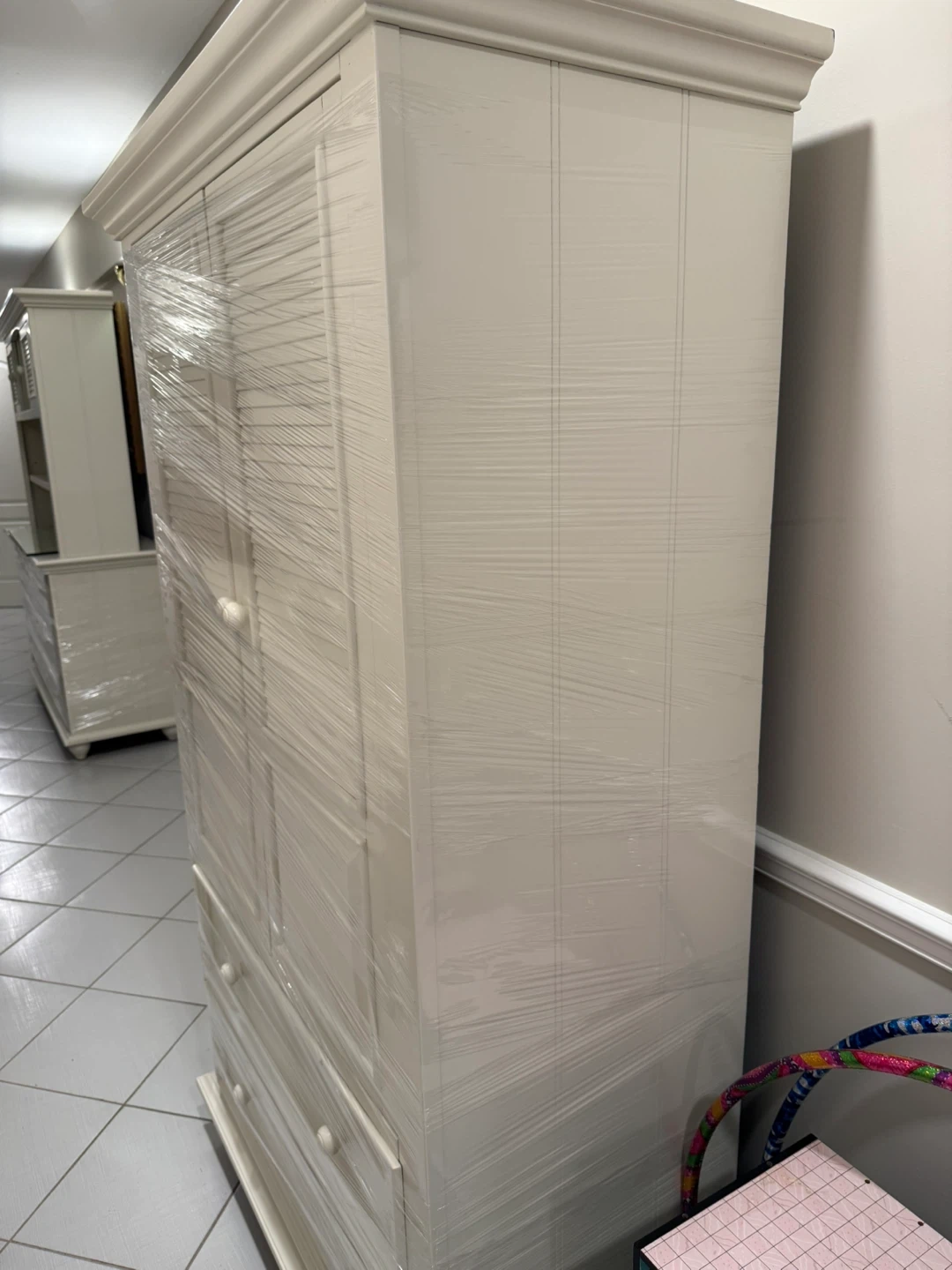 Selling a wardrobe and dresser set in good condition. The set includes a wardrobe with drawers and a dresser with a hutch. Both pieces are wrapped in plastic for protection during transport.