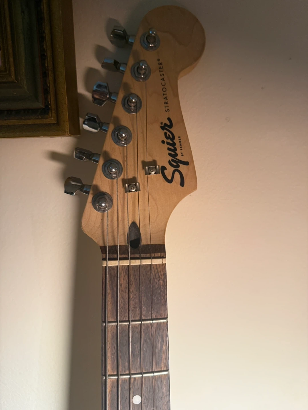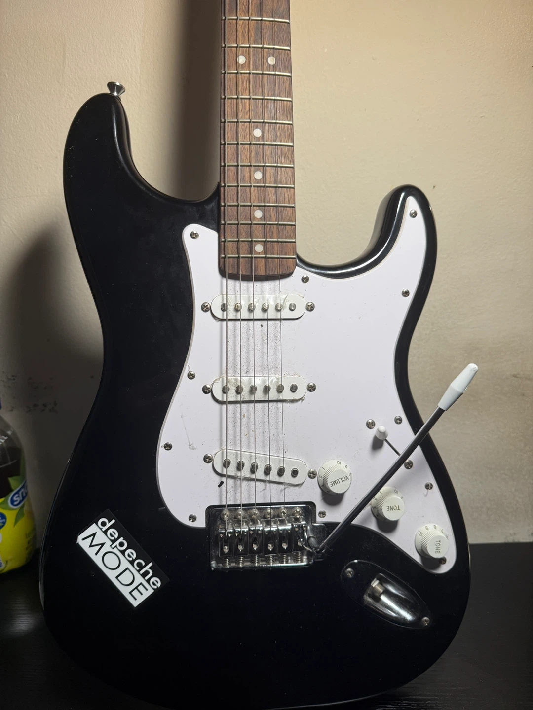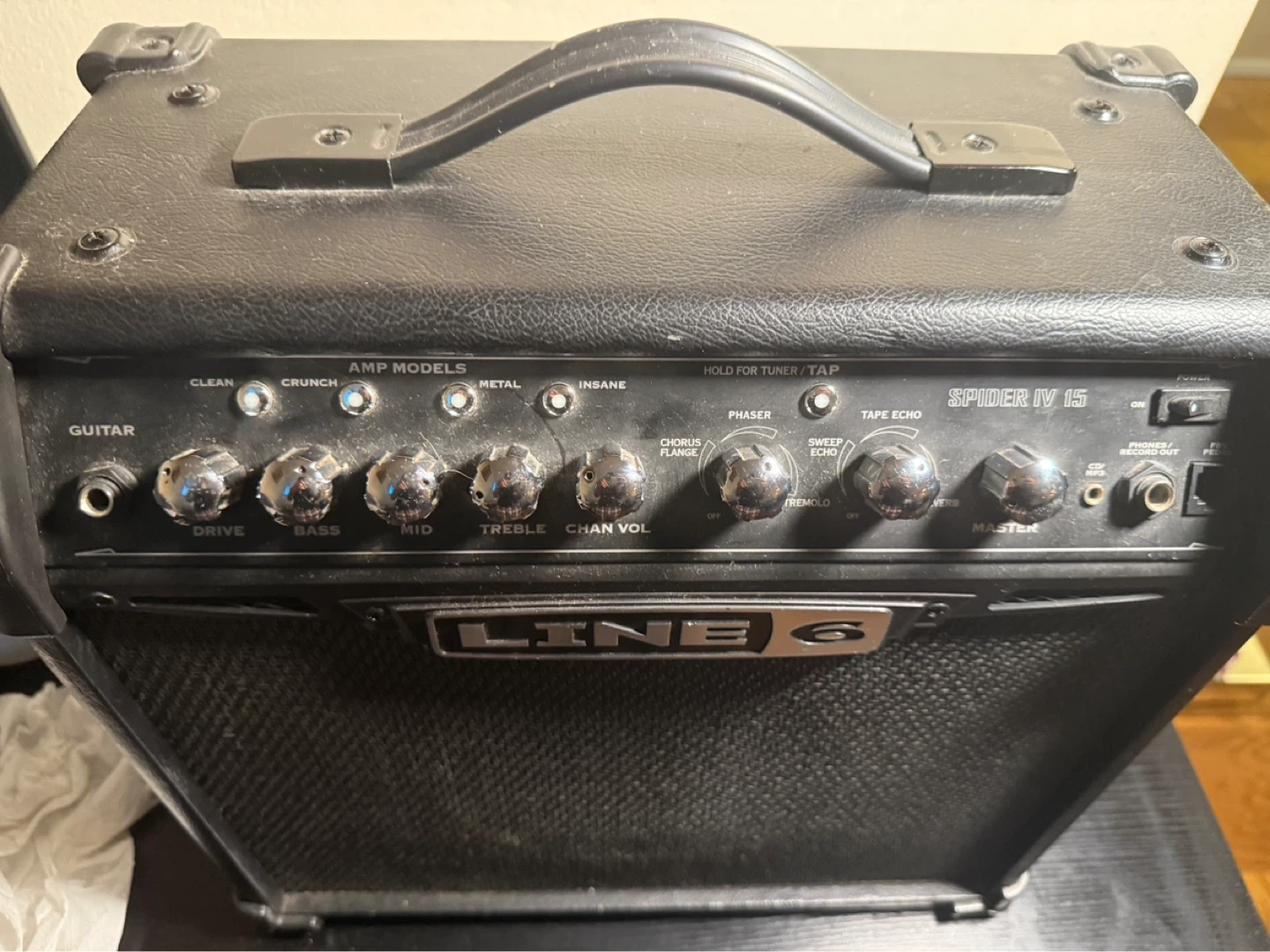 This is a Line 6 Spider IV 15 watt guitar amplifier. It features multiple amp models, effects, and a clean channel. It has a master volume knob and a headphone output. This amp is great for practice or small gigs! And it also comes with an electric guitar that is missing the last string but it’s an easy $5 fix to replace it it works great.