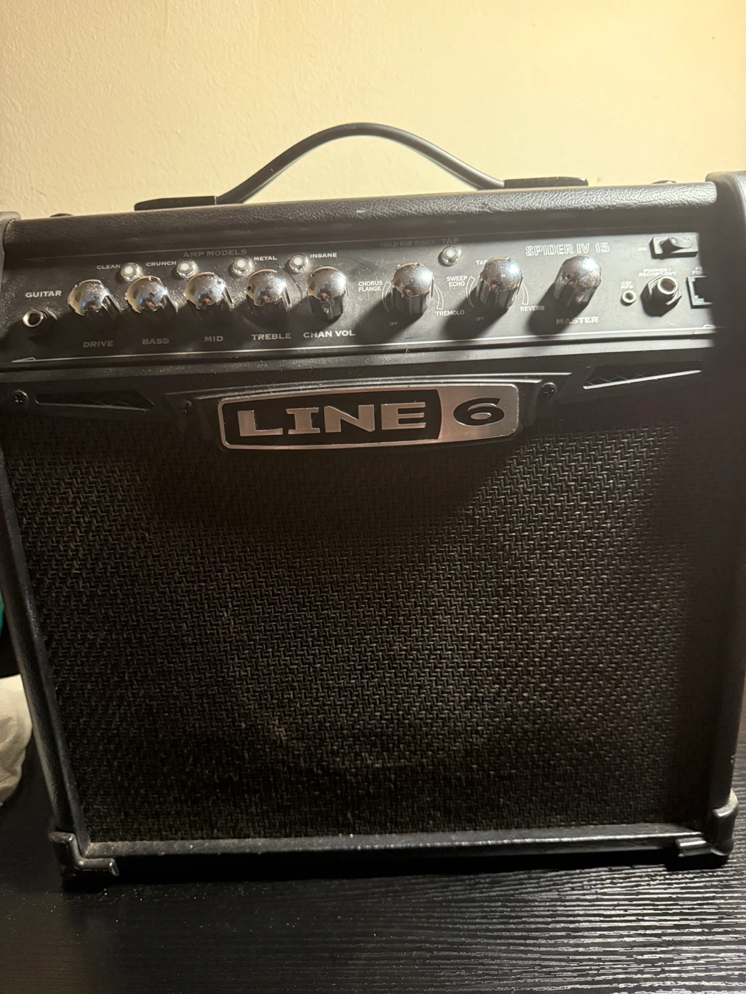 This is a Line 6 Spider IV 15 watt guitar amplifier. It features multiple amp models, effects, and a clean channel. It has a master volume knob and a headphone output. This amp is great for practice or small gigs! And it also comes with an electric guitar that is missing the last string but it’s an easy $5 fix to replace it it works great.