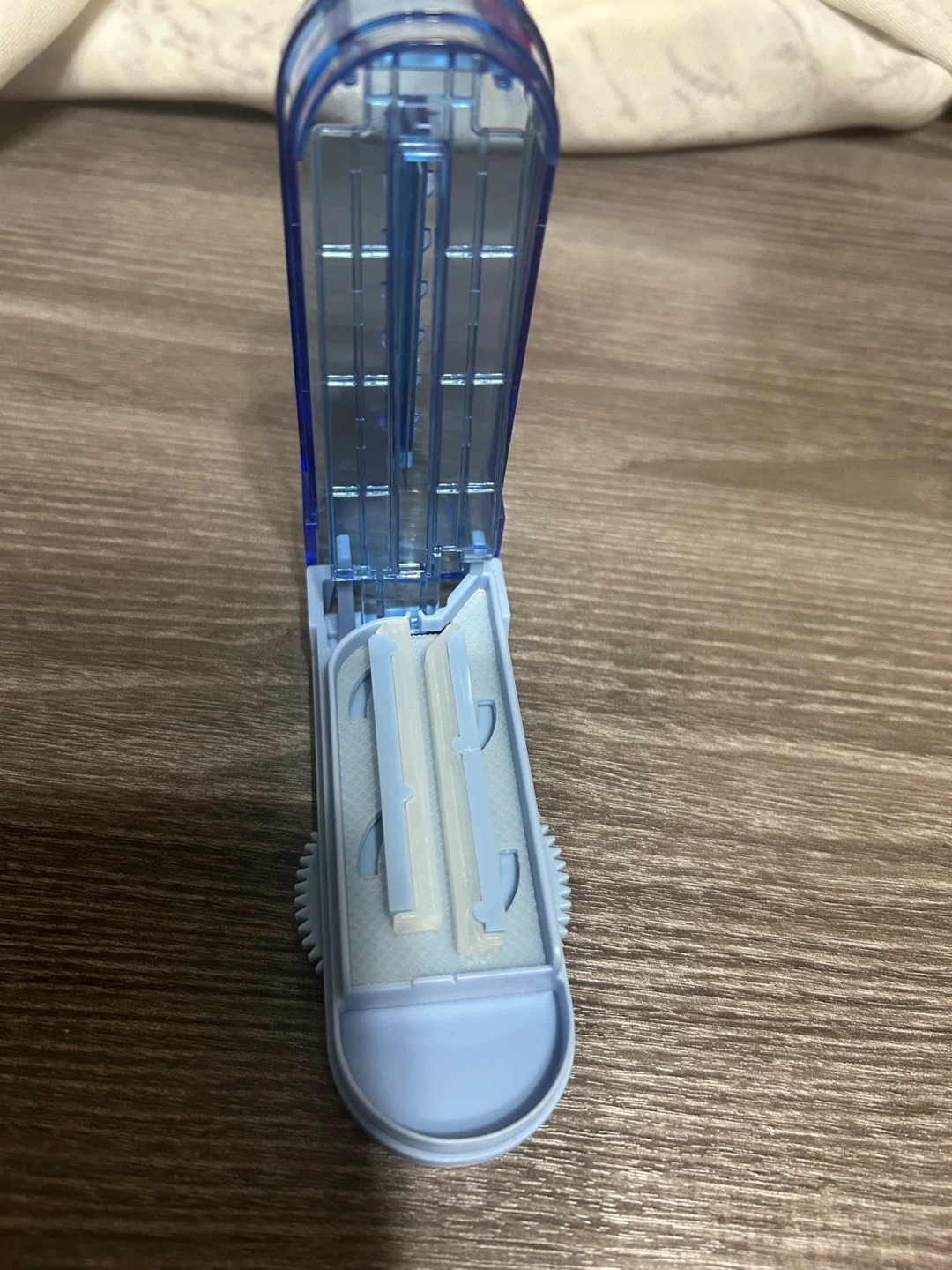 This new pill cutter features a transparent blue plastic design. It's suitable for cutting pills up to 15mm in size. You can cut pills into full, half, or quarter pieces.