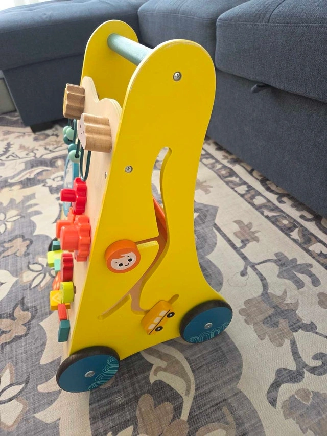 Beautifully crafted wooden baby walker with many Montessori busy board activities. Colorful and sturdy with a basket in the back. Wheels can be easily removed to just use as an upright busy board before baby starts standing or walking. Pick up near Martin Grove and Bloor. Open to offers.