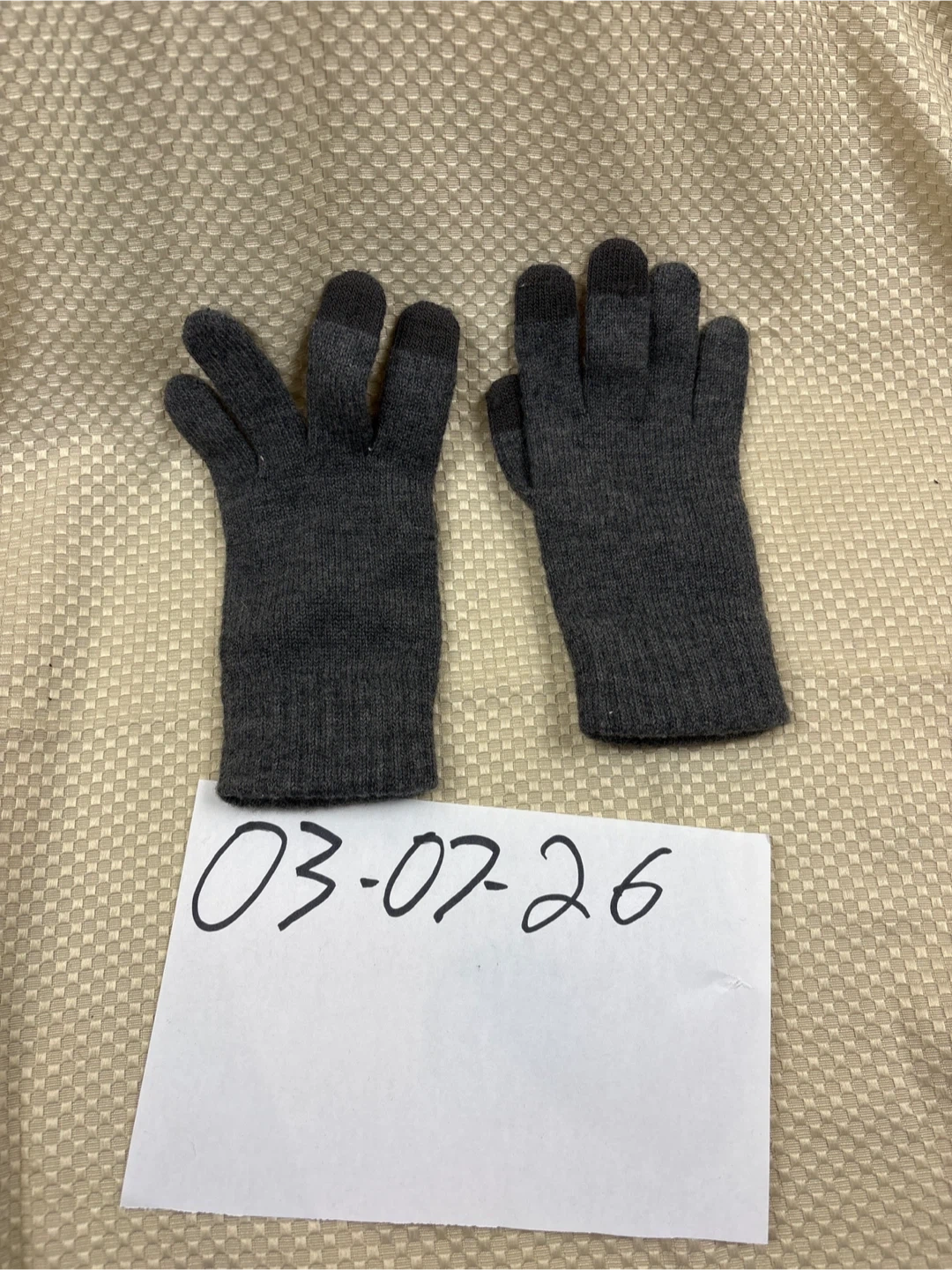A pair of dark grey knit gloves with touchscreen-compatible fingertips. Material is soft knit fabric. Keep your hands warm and connected this winter!