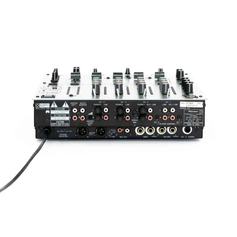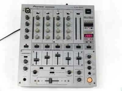 This Pioneer DJM 600 is in decent condition and fully working. The faders might need a cleaning or replacement, and some knobs are missing. Everything else works well. It's a 4-channel mixer with 3-band EQ on each channel. Features include an automatic BPM counter with manual tap input, a 6-second beat sampler, built-in digital effects that can be beat-synced, multiple line and phono inputs, crossfader curve adjustments, and a microphone input with a talk-over function.