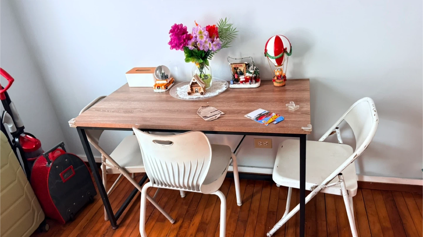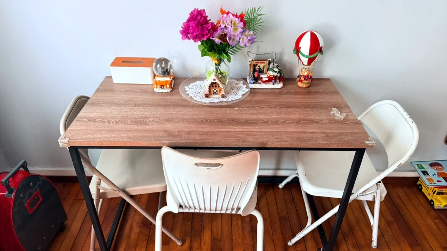 Mesa de madera con las patas de metal en muy buenas condiciones, se vende con 2 sillas, ideal para comedor.