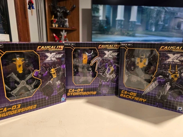 Selling a complete set of FansProject Causality Crossfire Insecticons figures. This set includes CA-03 Thundershred, CA-04 Stormbomb, and CA-05 Backfiery, all in their original boxes. Figures are like new, only displayed. Perfect for collectors. Cash accepted. Cashless payment accepted.