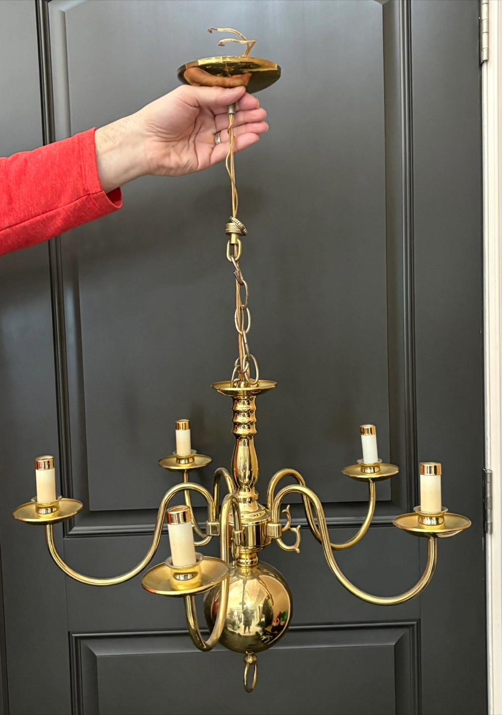 A brass chandelier with five arms. It's a classic design that would add elegance to any room. The brass finish is bright and shiny.