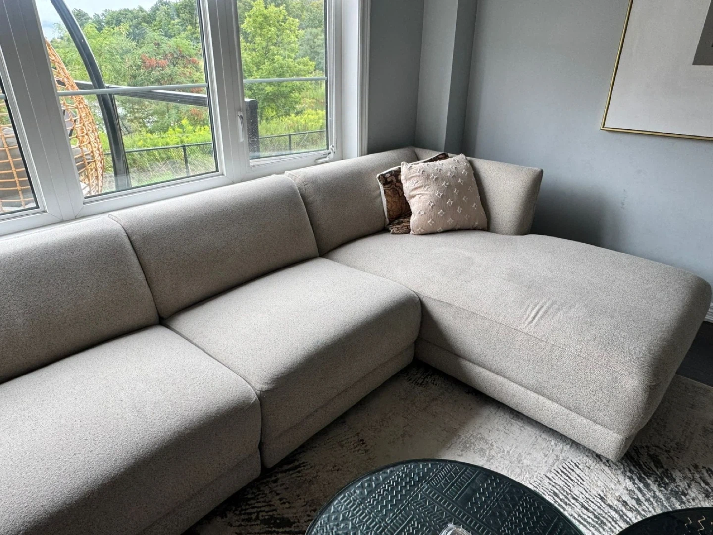 Spacious U-shaped sectional sofa in a neutral beige fabric. It's perfect for seating a large family or for entertaining guests. Comfortable and stylish addition to any living room!