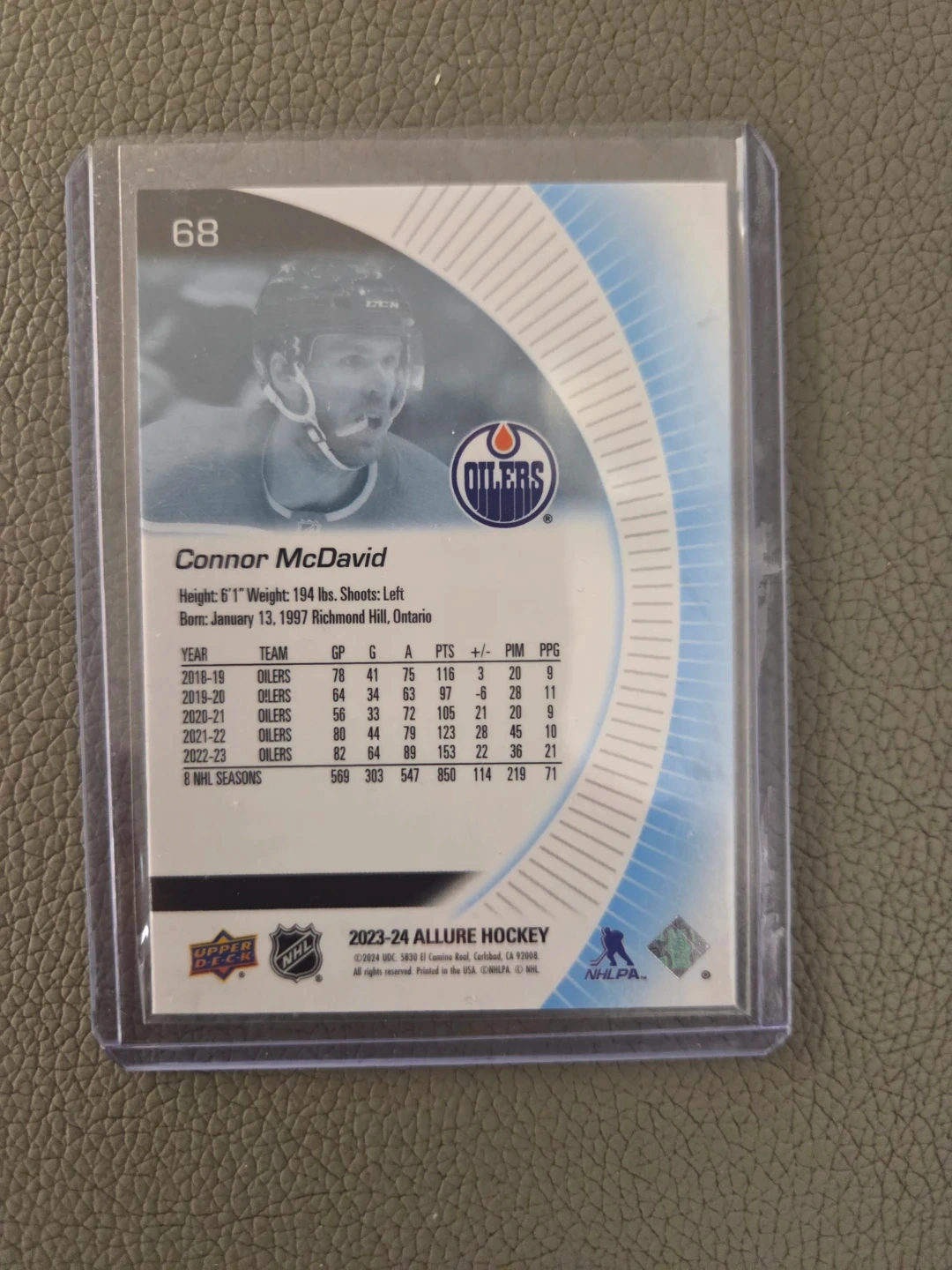 This is a 2023-24 Upper Deck Allure Hockey card featuring Connor McDavid. It includes his stats and details like height and birth date. NHLPA licensed.