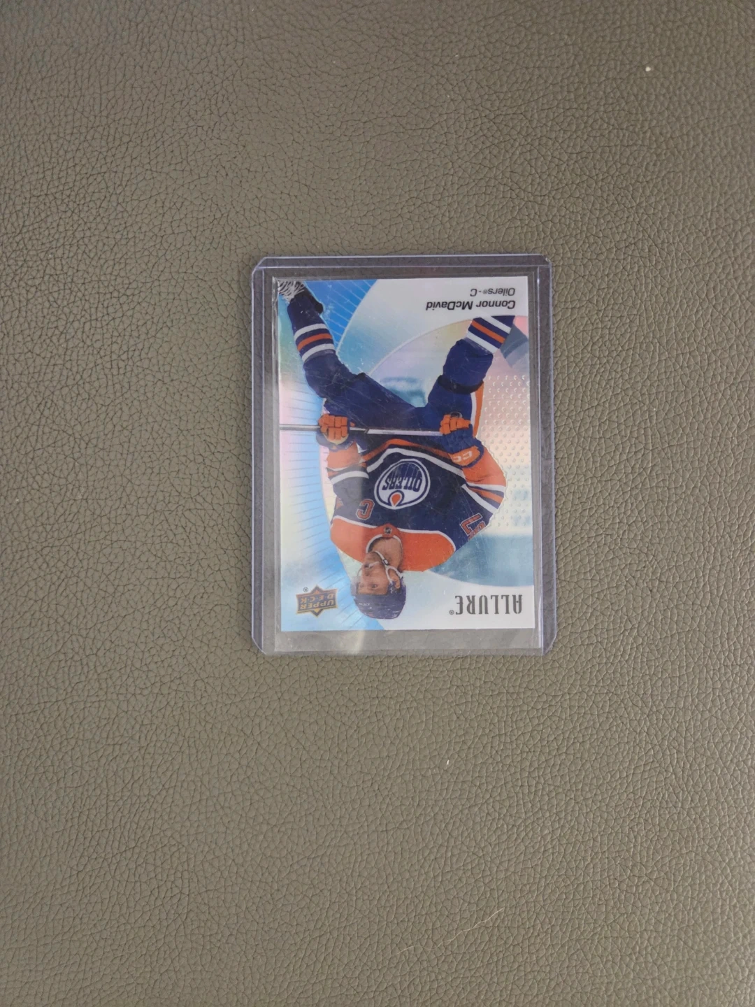 This is a 2023-24 Upper Deck Allure Hockey card featuring Connor McDavid. It includes his stats and details like height and birth date. NHLPA licensed.