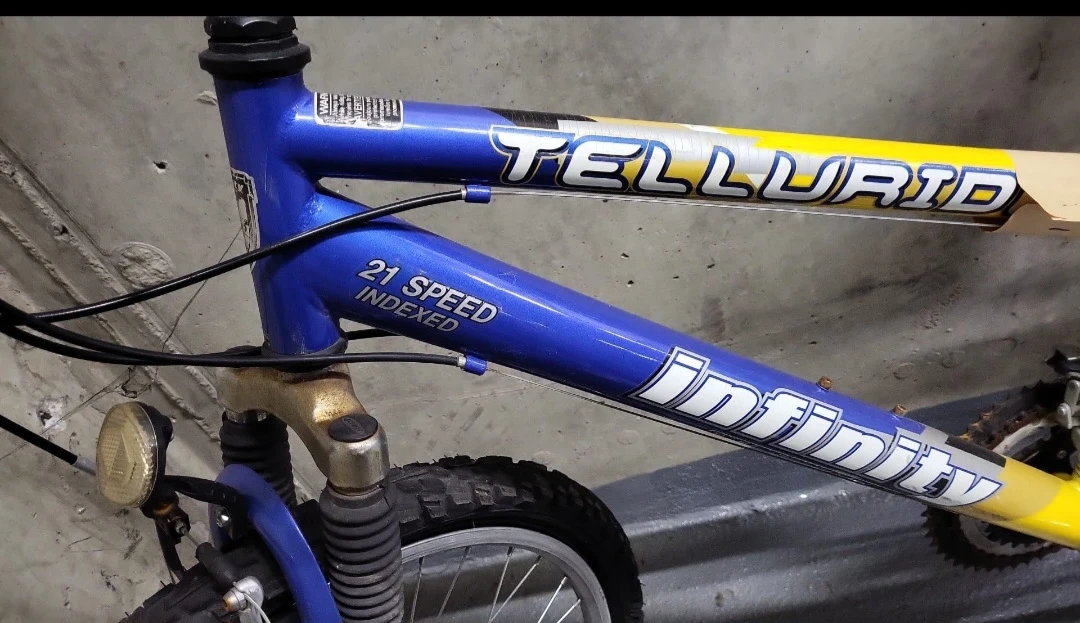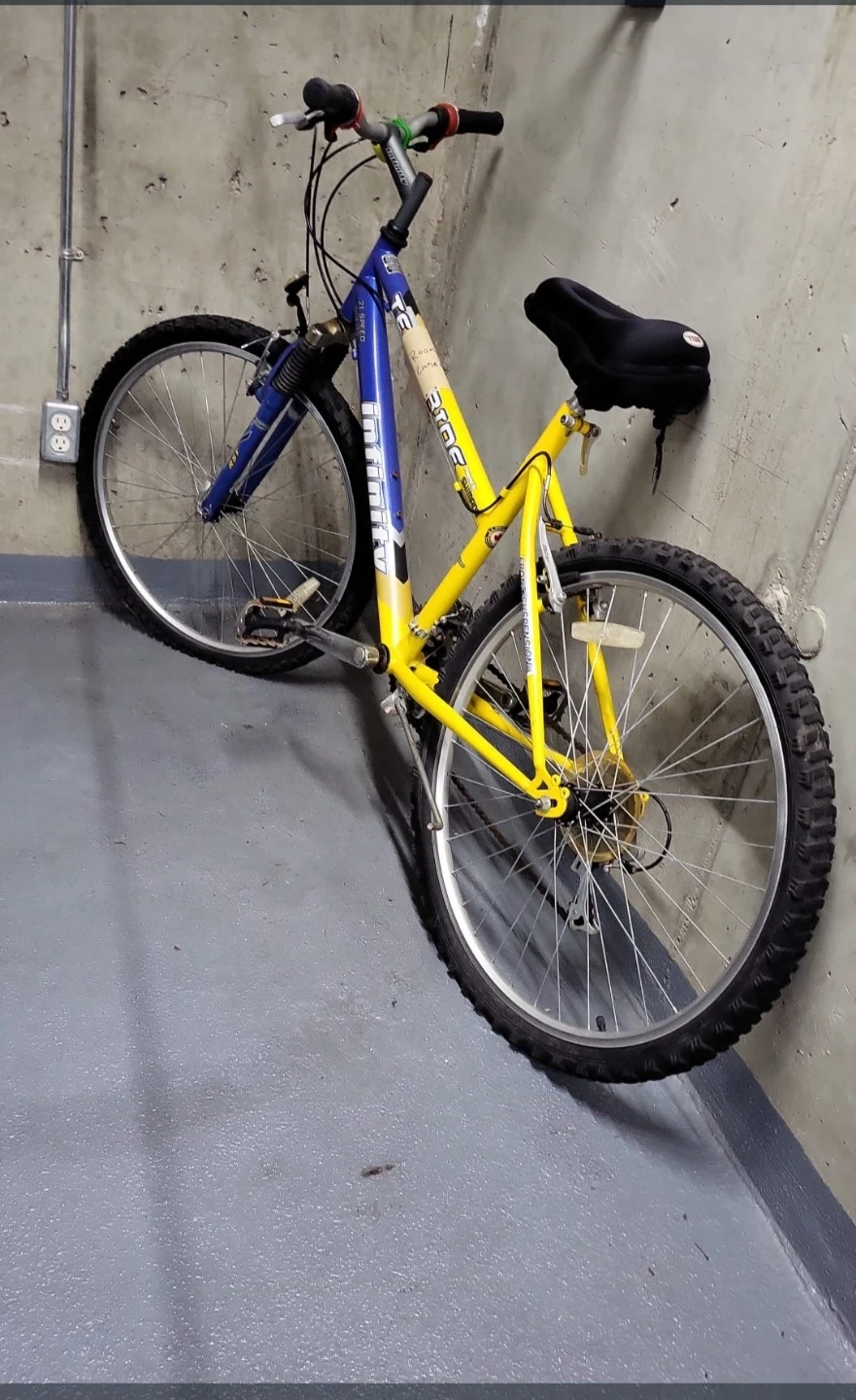 Blue and yellow Infinity Ride mountain bike with knobby tires. It has front suspension and a comfortable black seat cover. This bike's got a classic look for cruising around town or hitting light trails!