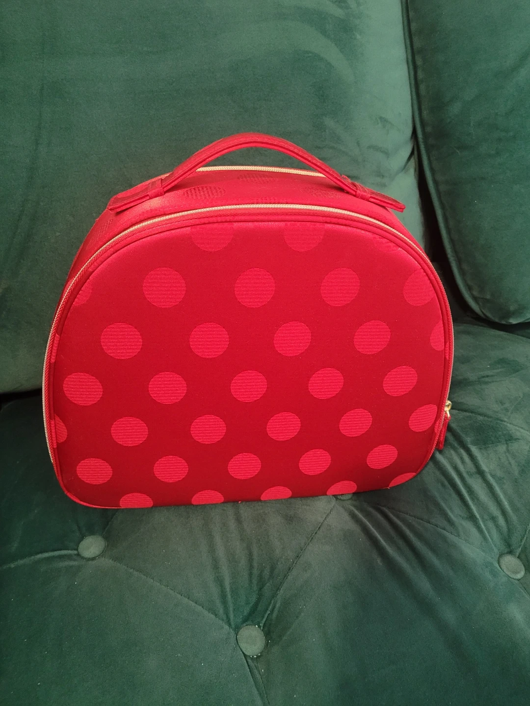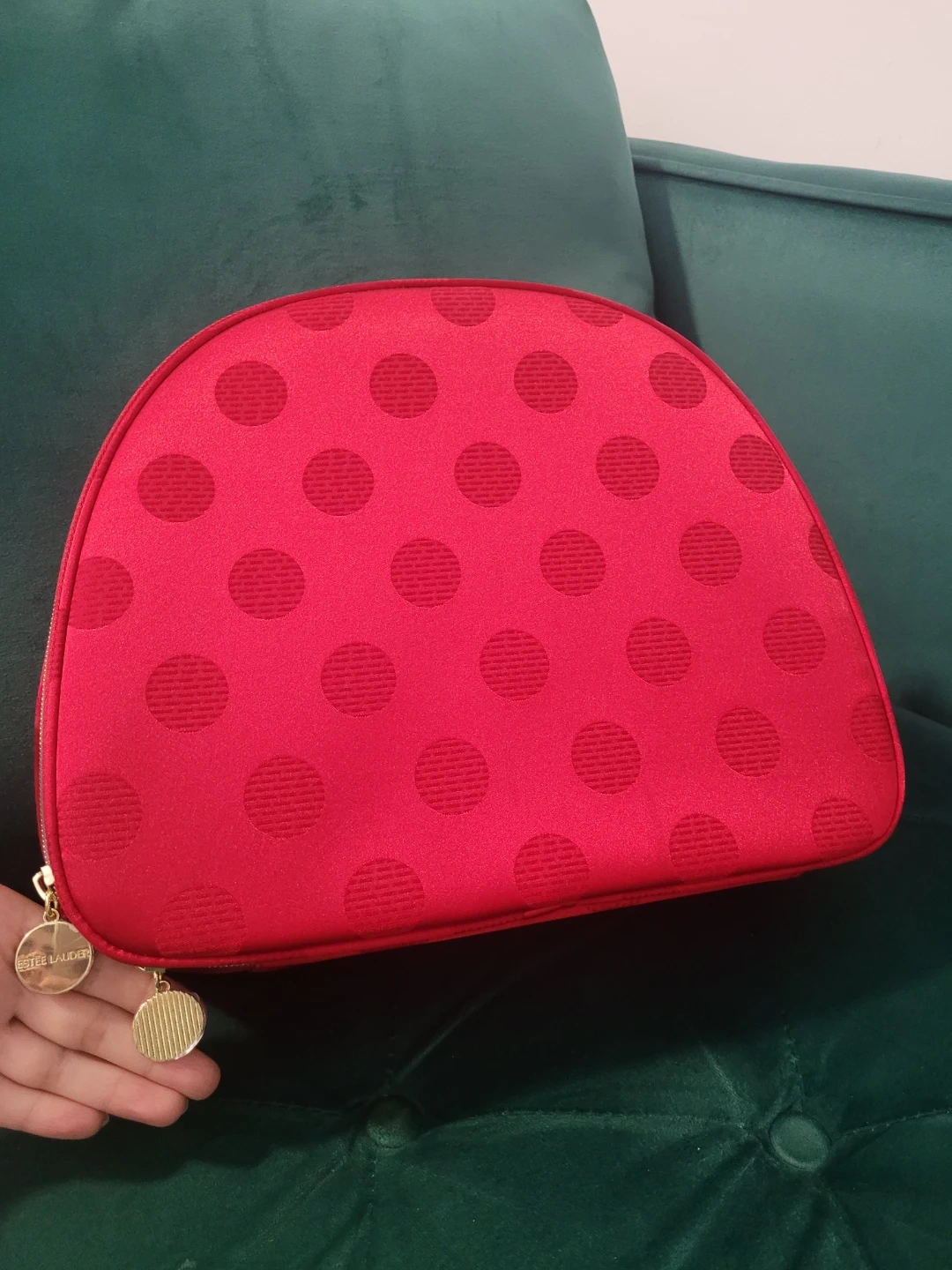 This is a bright red makeup bag from Estée Lauder. It features a fun polka dot pattern and a zippered closure. It's great for organizing your cosmetics!