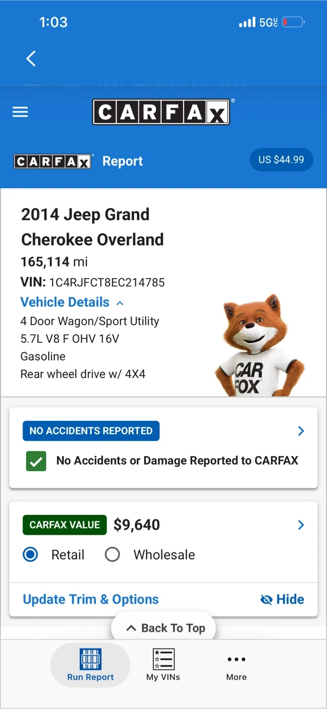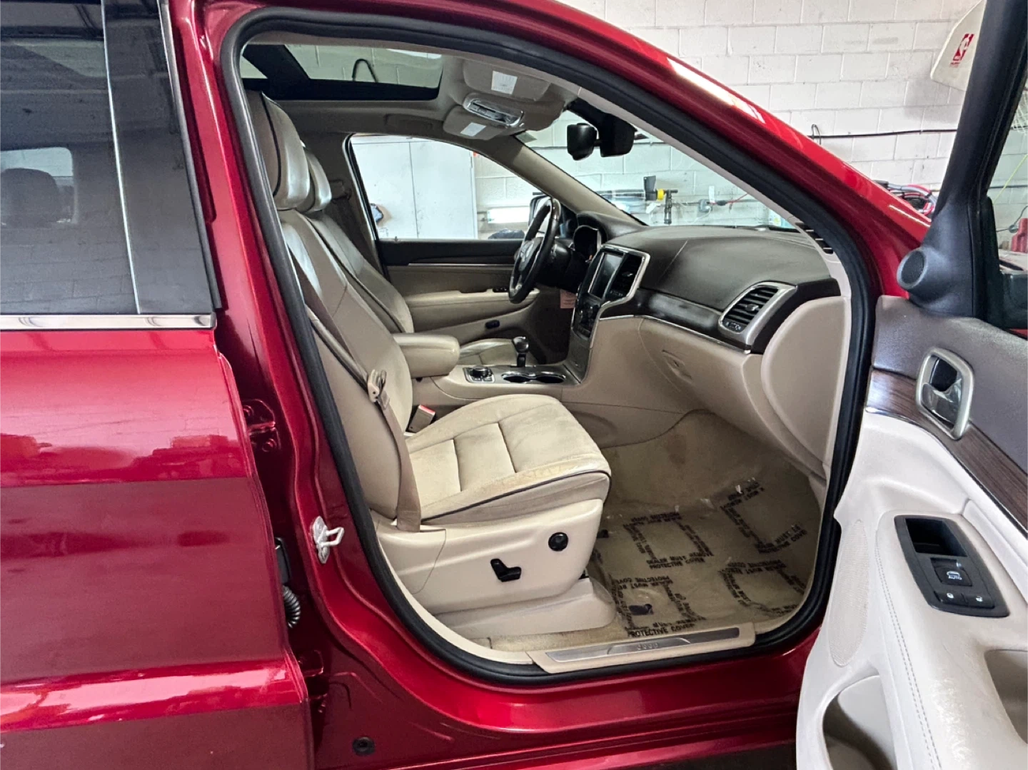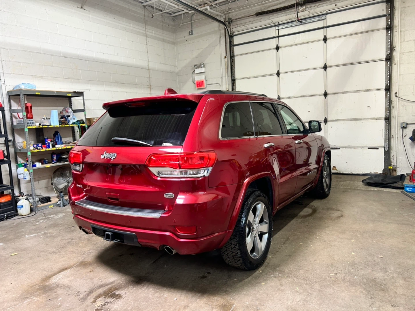 2014 Jeep Grand Cherokee Overland. Red exterior with tan leather interior. 165,114 miles. 5.7L V8 engine. No accidents reported to CARFAX. Sunroof and 4WD.
