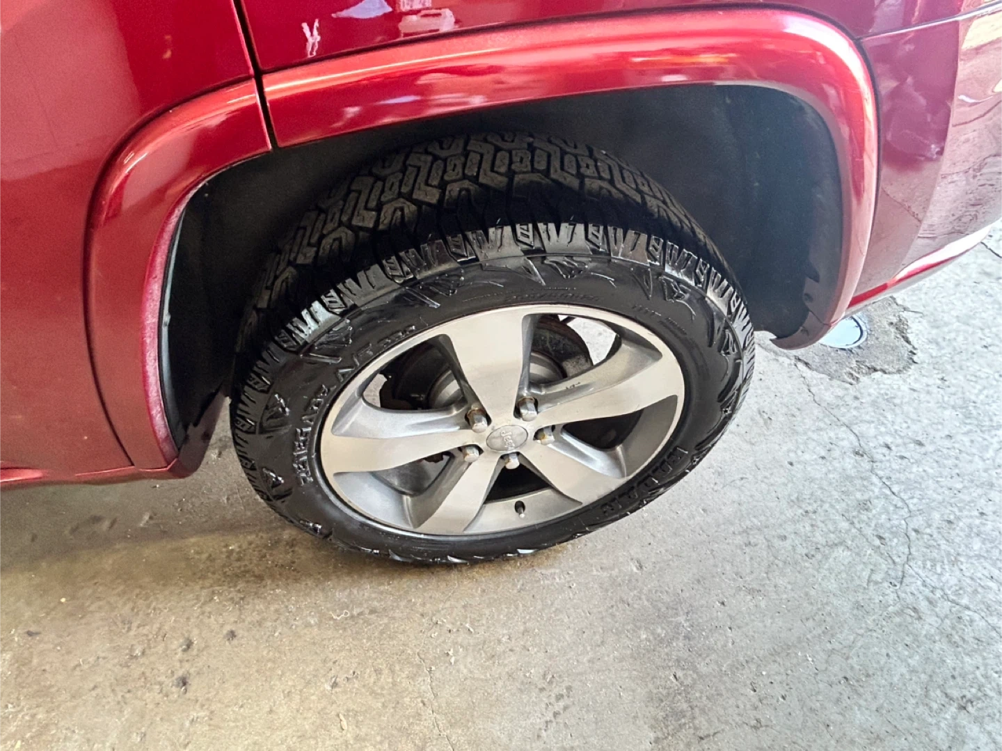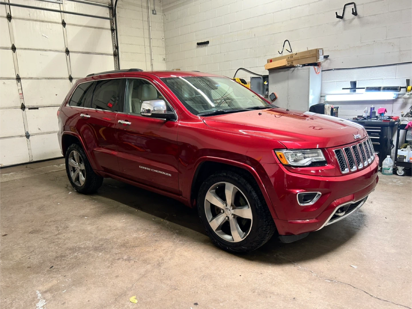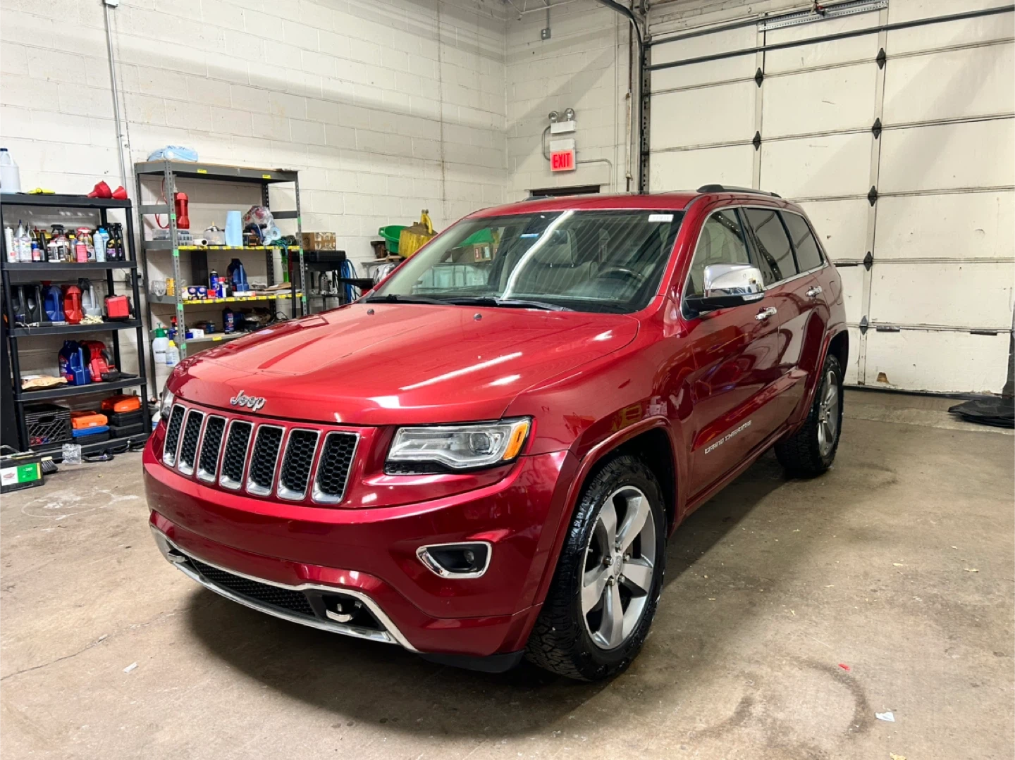 2014 Jeep Grand Cherokee Overland. Red exterior with tan leather interior. 165,114 miles. 5.7L V8 engine. No accidents reported to CARFAX. Sunroof and 4WD.