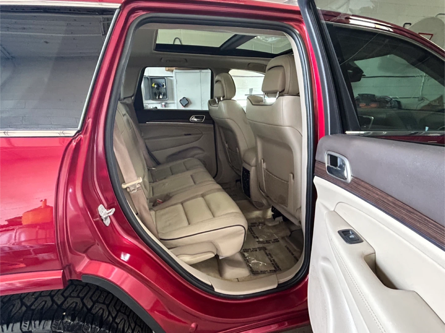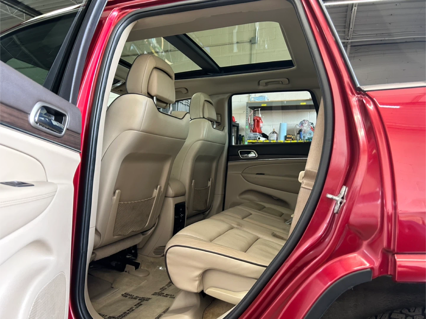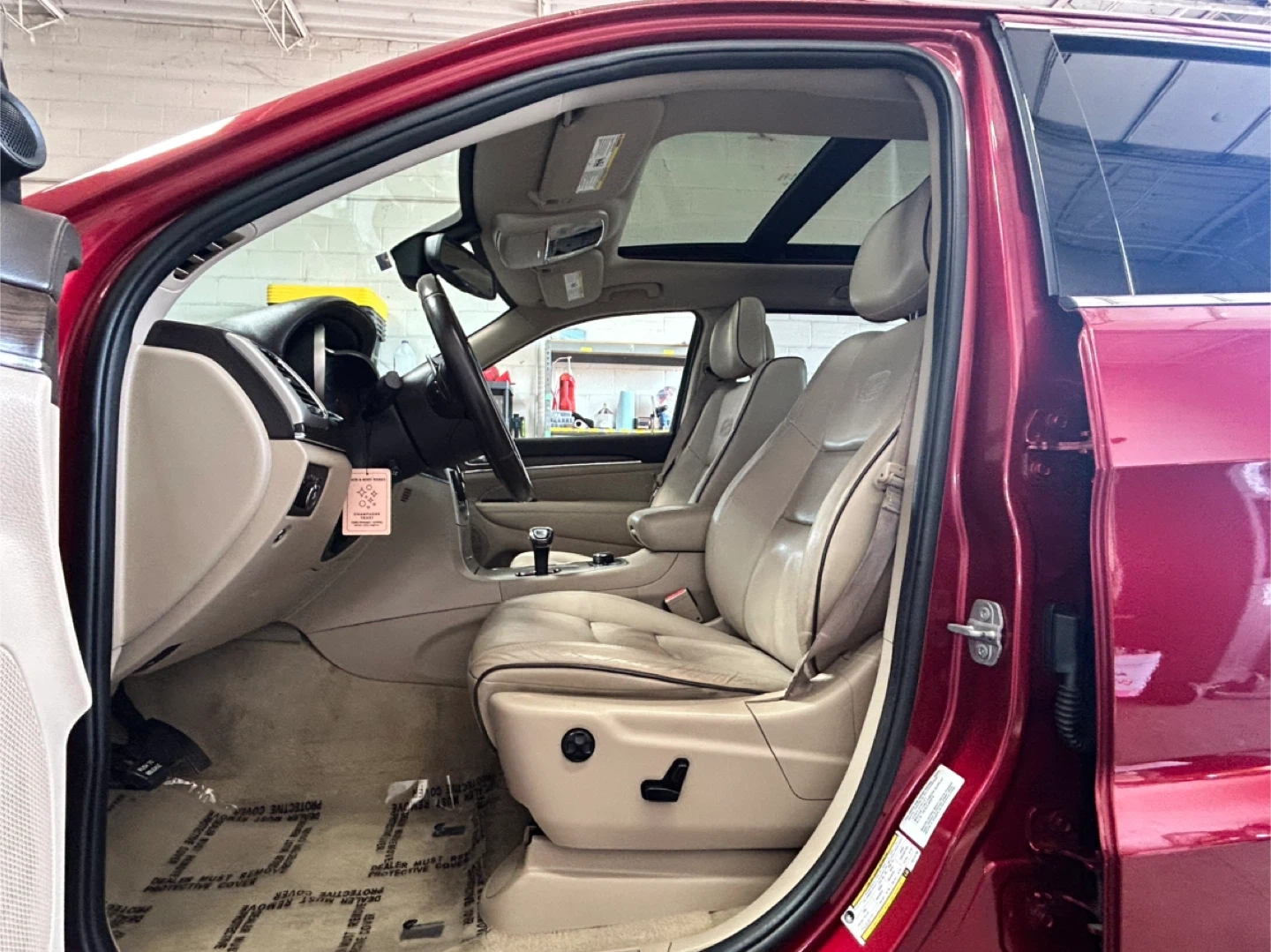 2014 Jeep Grand Cherokee Overland. Red exterior with tan leather interior. 165,114 miles. 5.7L V8 engine. No accidents reported to CARFAX. Sunroof and 4WD.