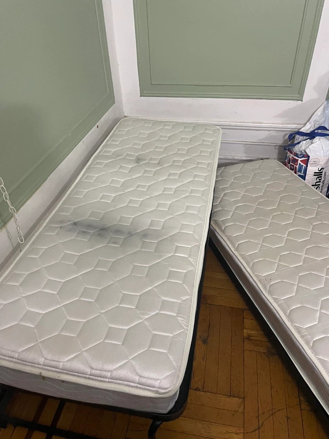 Day bed a convertible piece that can be used as a sofa or a bed. Twin size mattress minor stain or two (juice). It has a metal frame with wheels for easy movement. It's a versatile item for small spaces! (The black marks are from the frame itself pressing down on the mattress when we sat as both have been switched out from bottom to top at certain points)