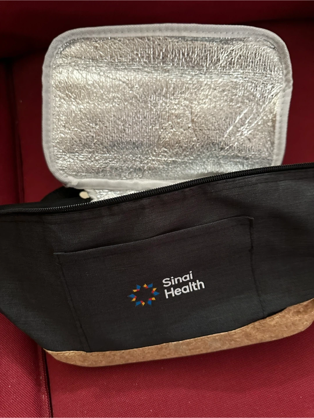 Black insulated lunch bag with a cork bottom accent. It's perfect for keeping your food cool on the go. Interior lining helps maintain temperature. Zipper closure for secure storage.