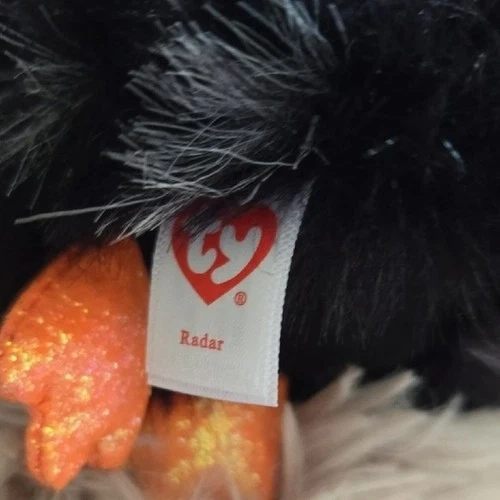 Radar is a black bat with red button eyes and a black nose. His ears are white and he has black felt feet and wing claws.