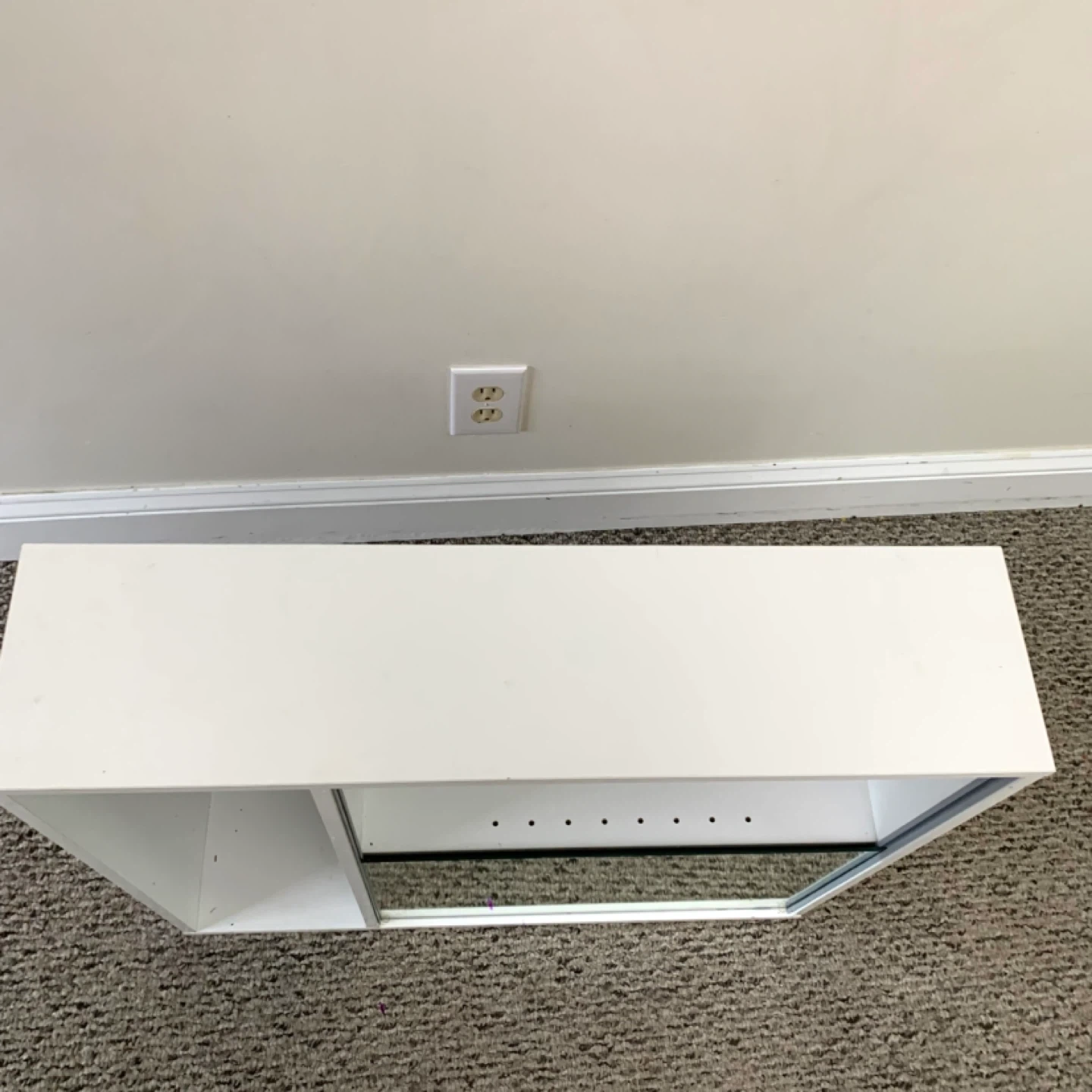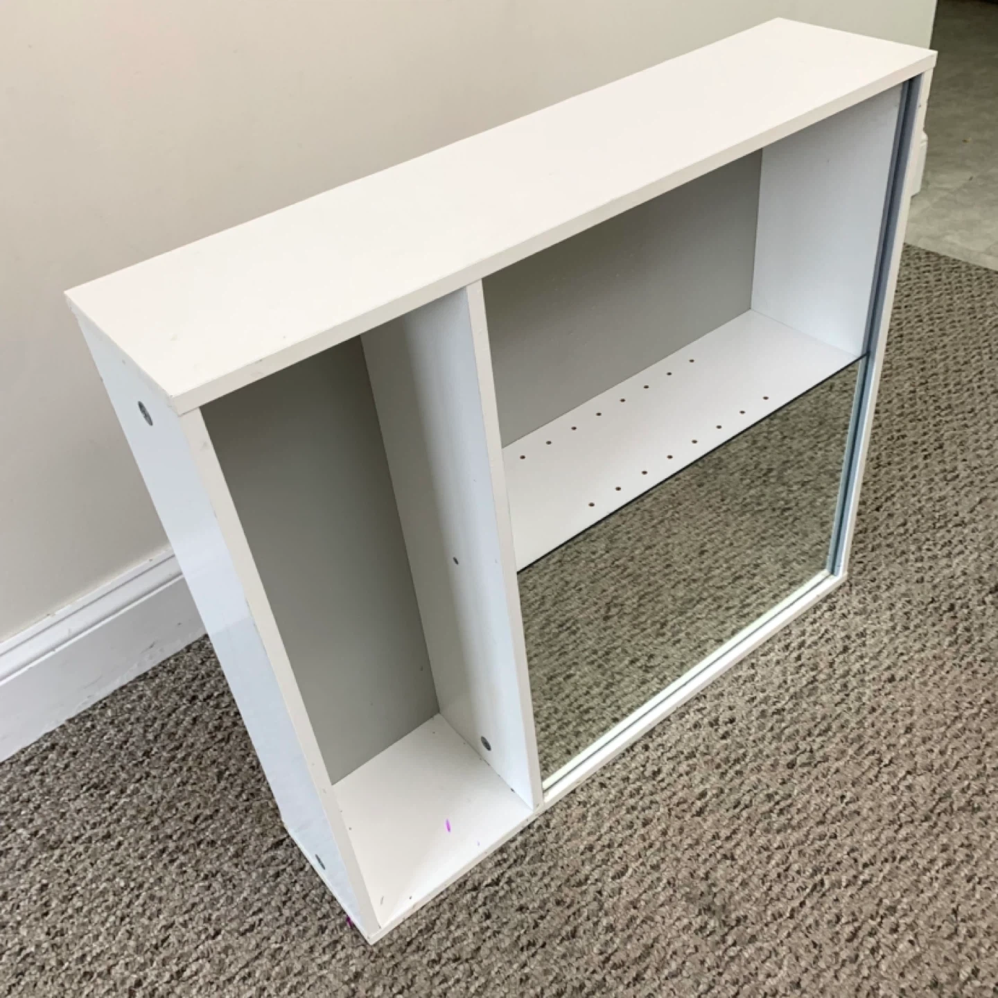 White wall shelf mirror cabinet storage unit perfect for bathroom, entryway, or small spaces. Features mirrored door with interior shelving plus two open compartments for easy access to everyday items, combining storage and style in one compact design. Great for organizing toiletries, decor, or small essentials.