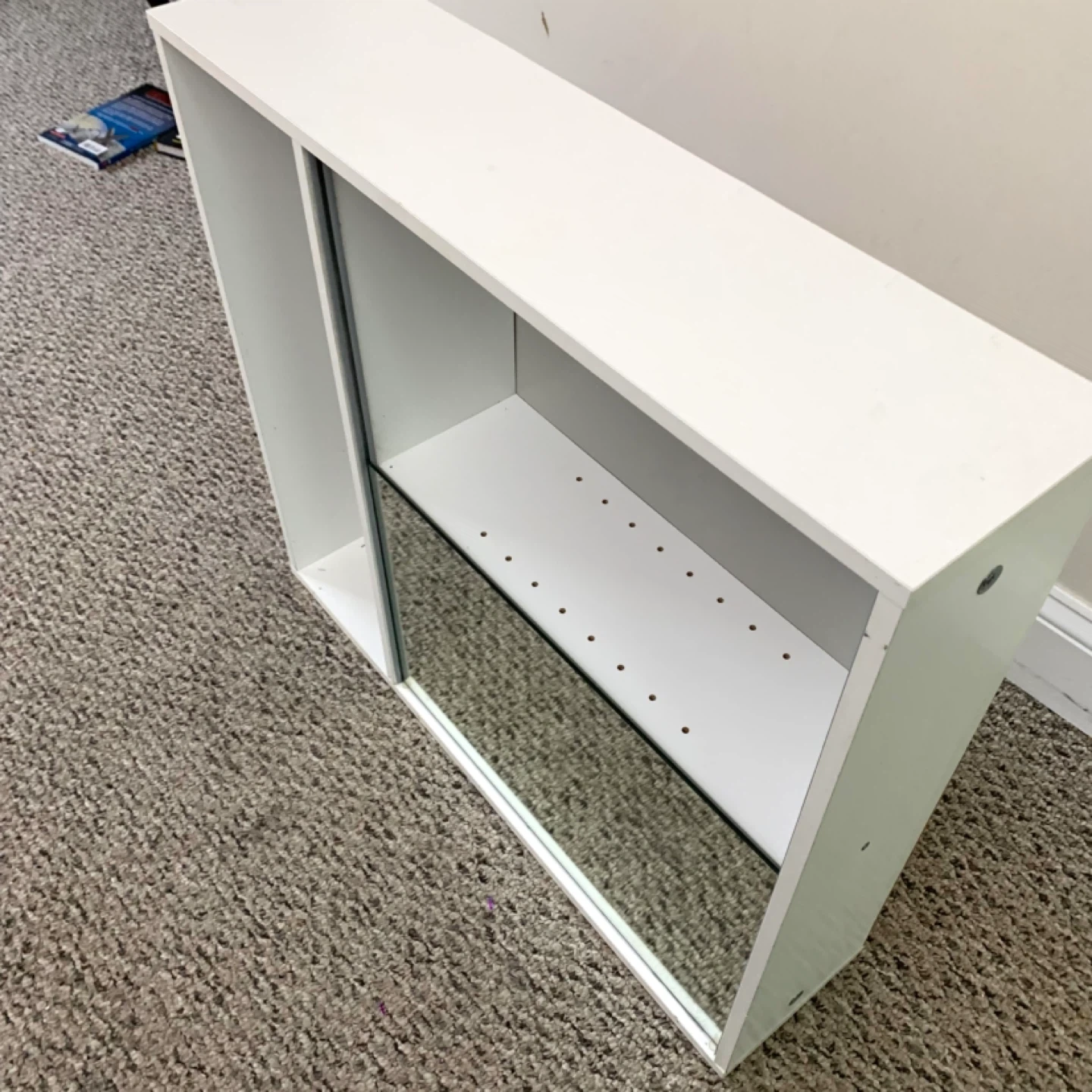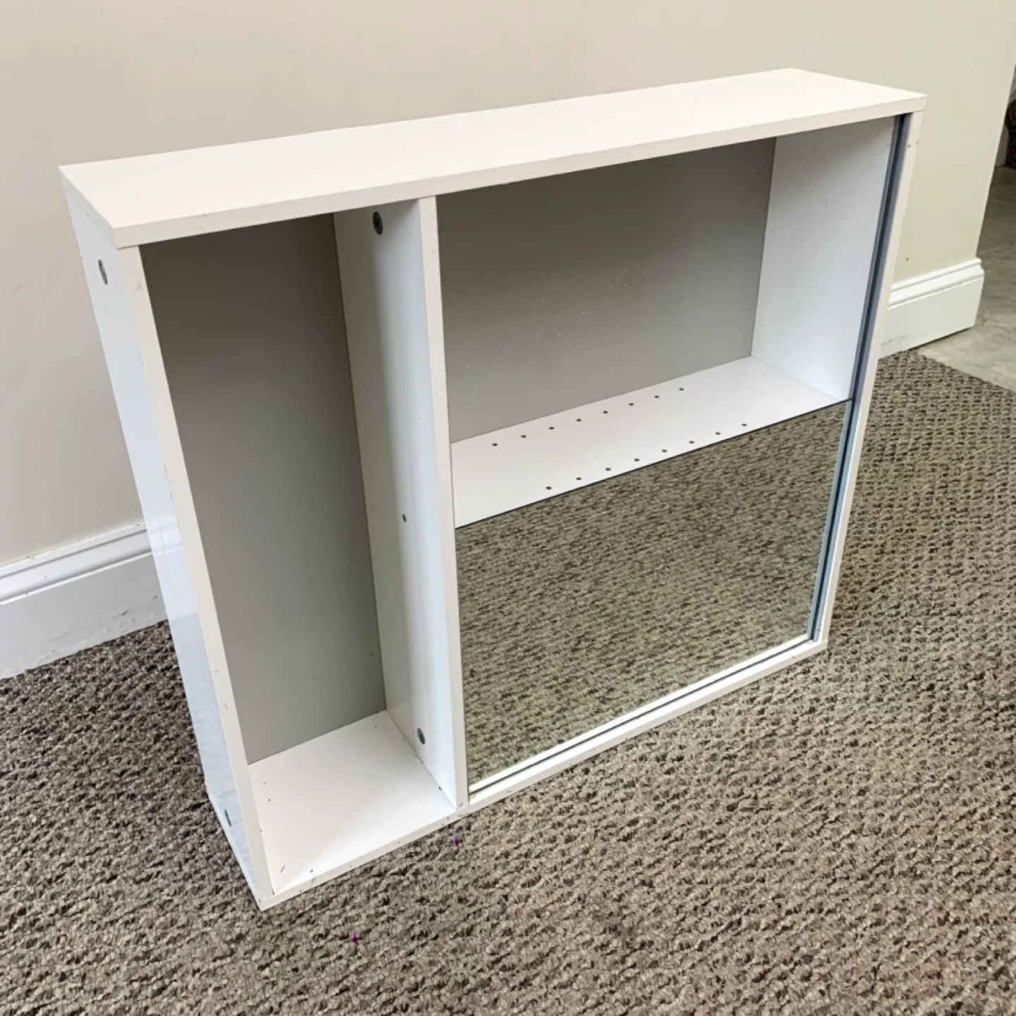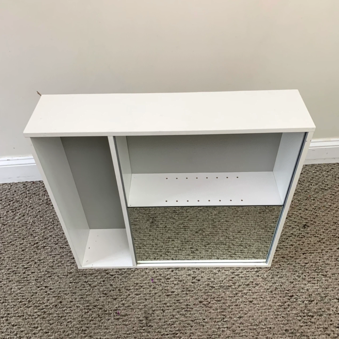 White wall shelf mirror cabinet storage unit perfect for bathroom, entryway, or small spaces. Features mirrored door with interior shelving plus two open compartments for easy access to everyday items, combining storage and style in one compact design. Great for organizing toiletries, decor, or small essentials.