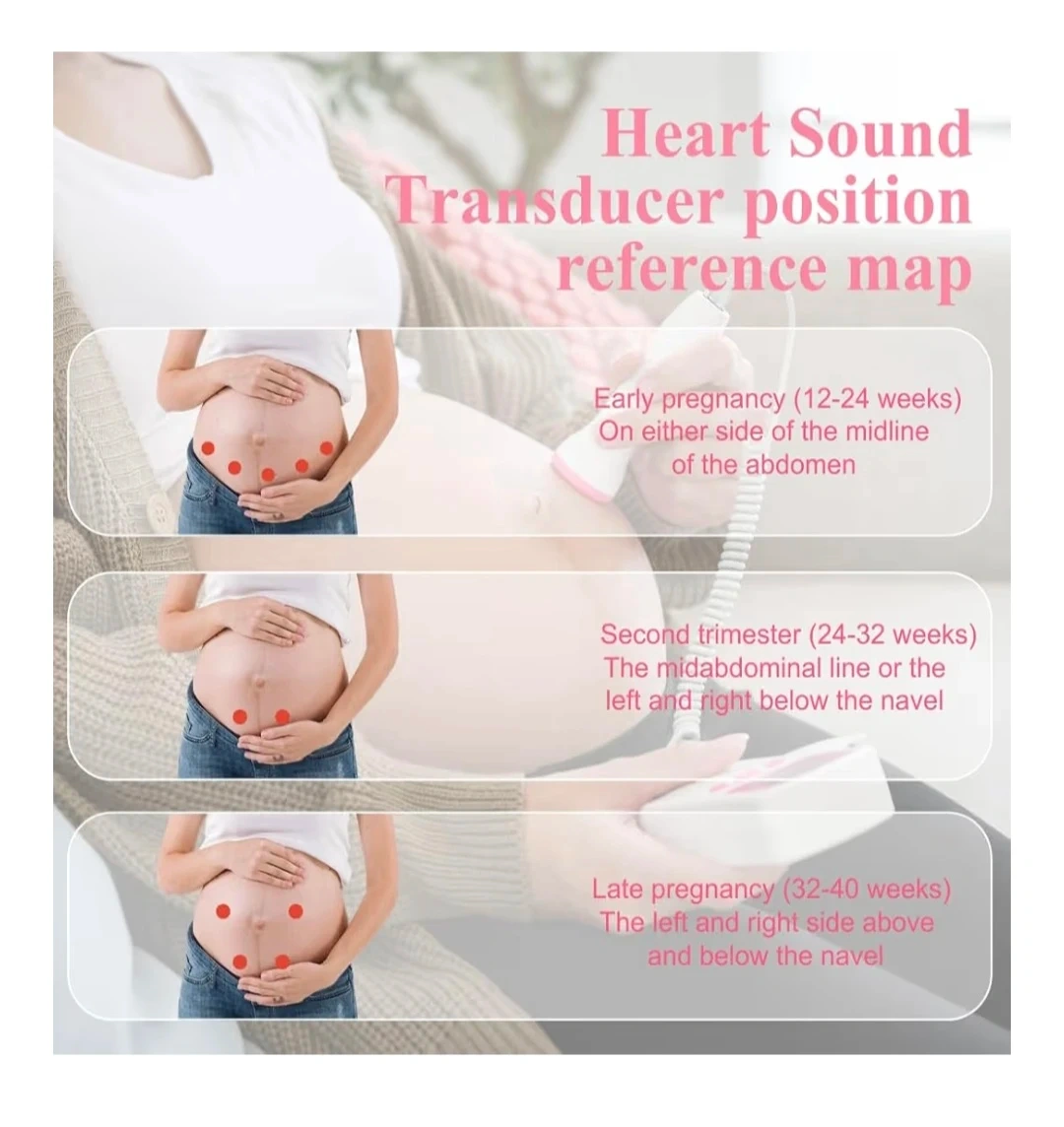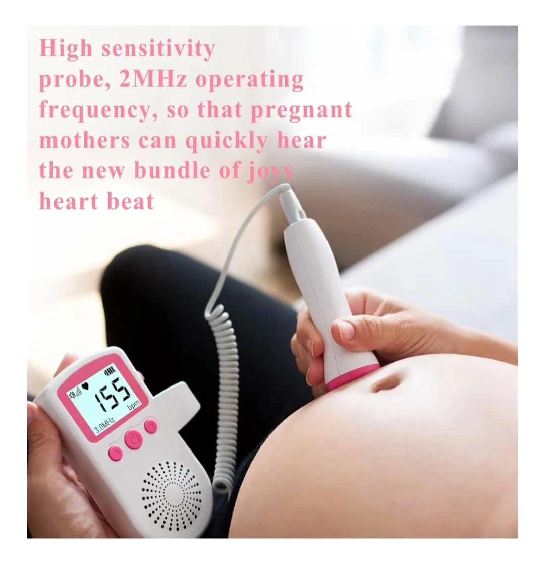 This handheld fetal Doppler is designed to let pregnant mothers easily listen to their baby's heartbeat. It features a high sensitivity probe and an OLED display for clear visibility. The device is easy to operate, with adjustable volume and a clear display of the heart rate in beats per minute.