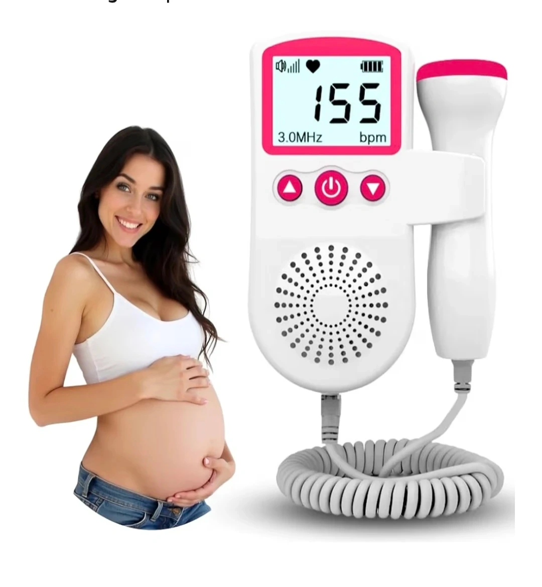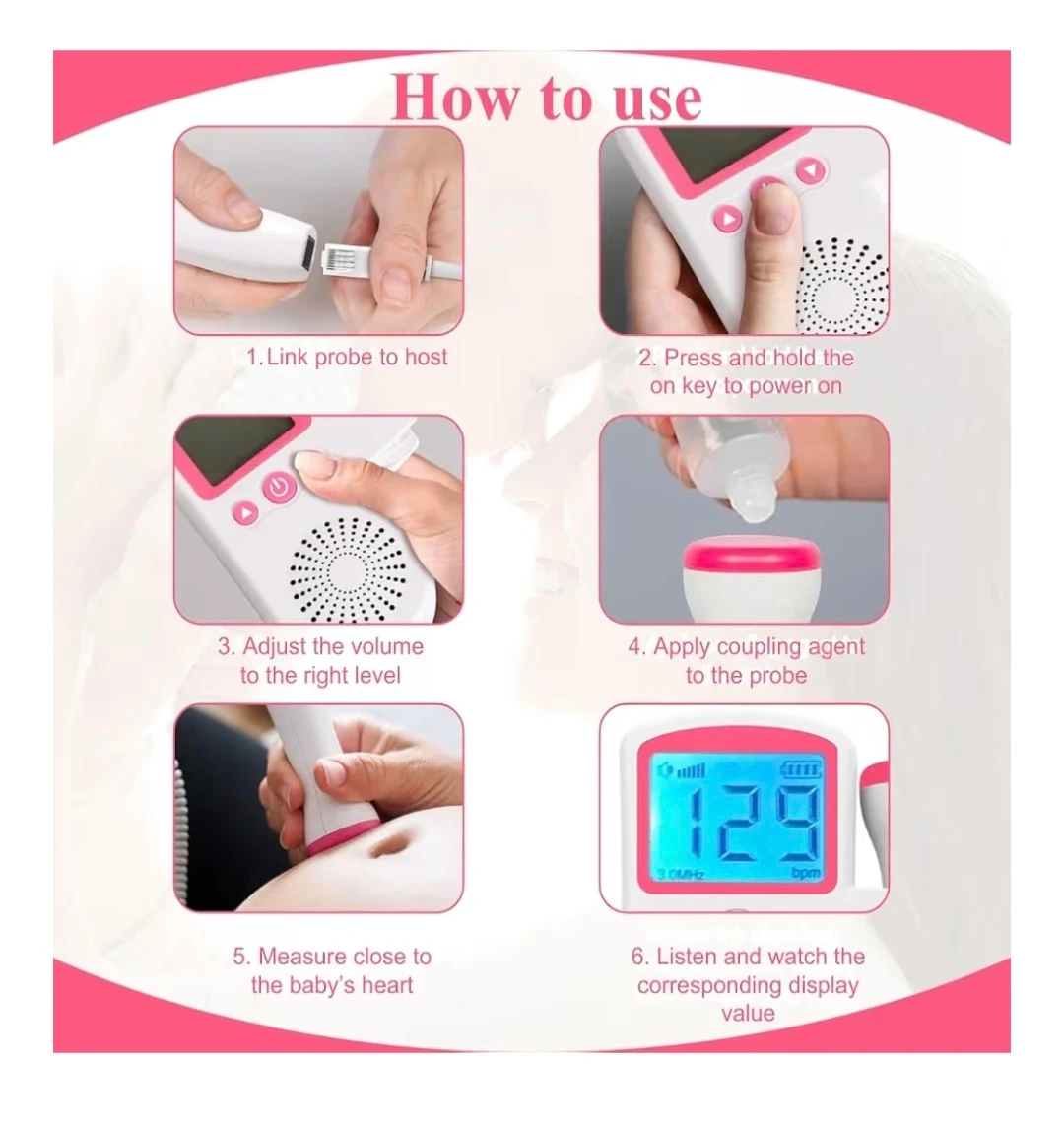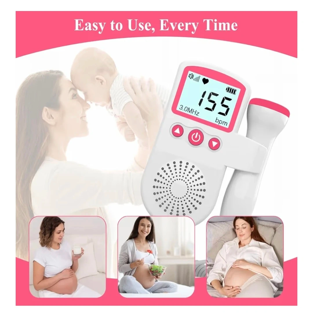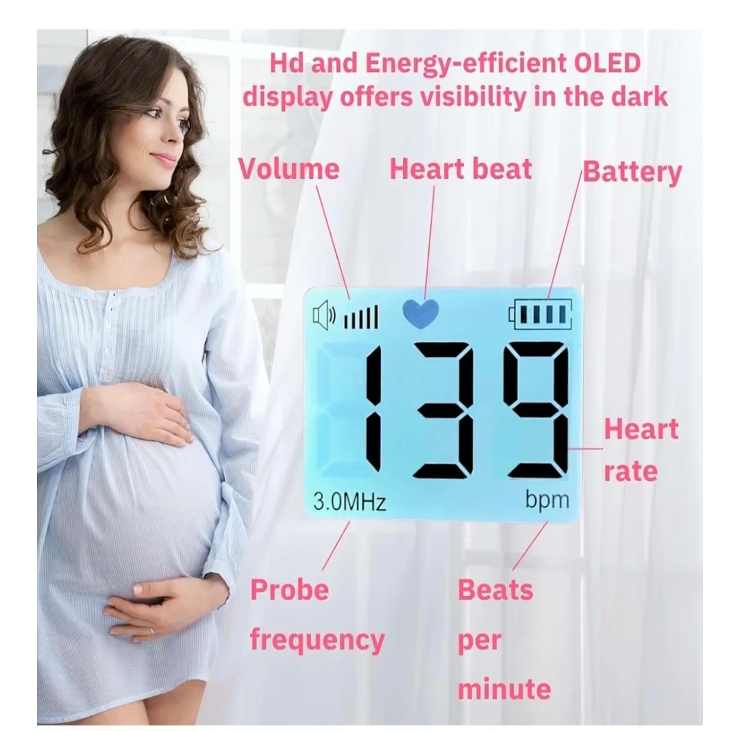 This handheld fetal Doppler is designed to let pregnant mothers easily listen to their baby's heartbeat. It features a high sensitivity probe and an OLED display for clear visibility. The device is easy to operate, with adjustable volume and a clear display of the heart rate in beats per minute.
