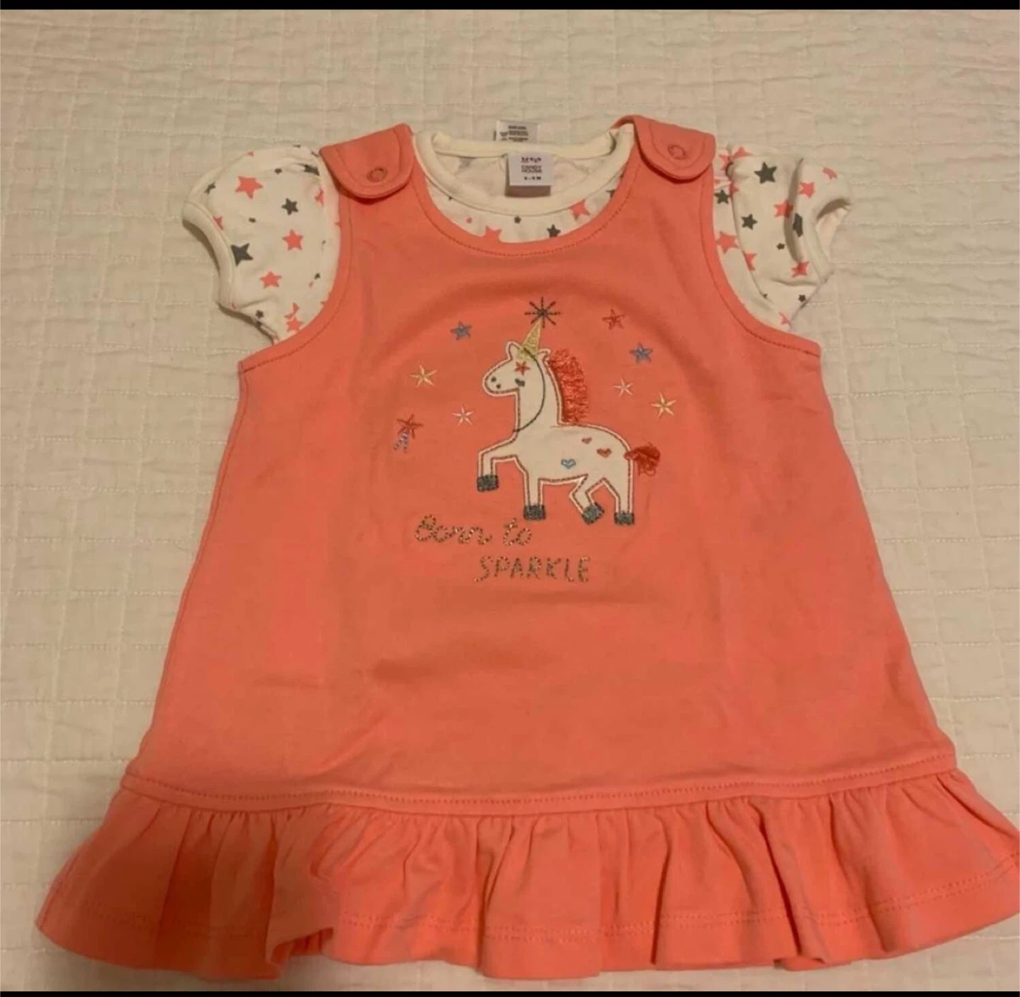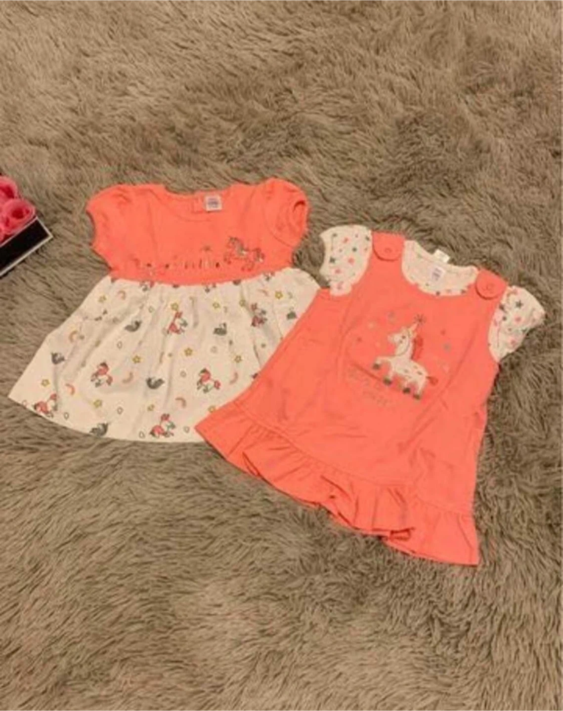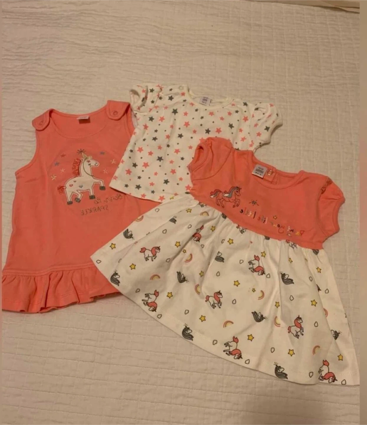 Three-piece baby girls' unicorn dress set from Candy House. Includes two coral pink dresses and one white star-print top. Dresses feature unicorn graphics and ruffles. Size 6-9 months.