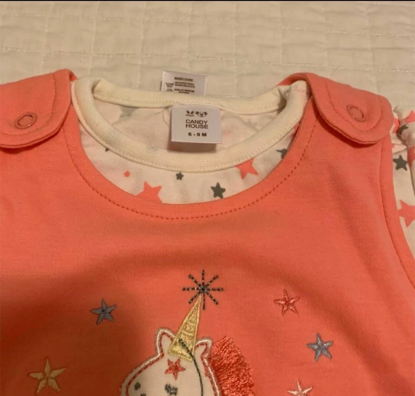 Three-piece baby girls' unicorn dress set from Candy House. Includes two coral pink dresses and one white star-print top. Dresses feature unicorn graphics and ruffles. Size 6-9 months.