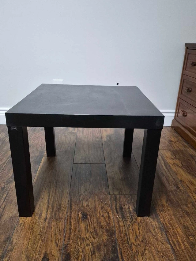 This is a black IKEA Lack side table, perfect for small spaces. It's sturdy and simple, ideal as a coffee table or nightstand. It is in used condition, so please see the photos for details. Dimensions: 55x55 cm, Height: 45 cm. Material: Wood/Particleboard. Cash accepted.