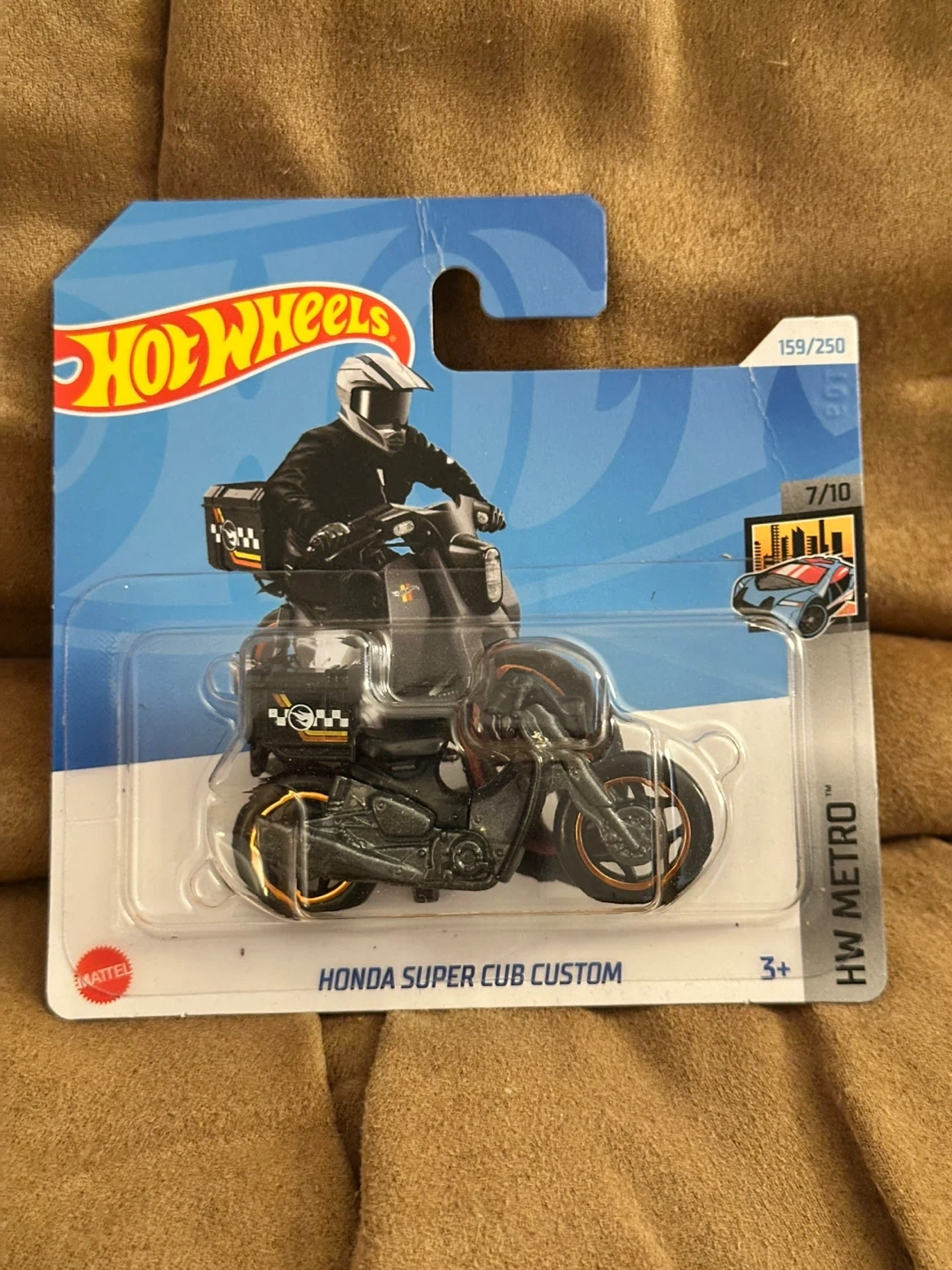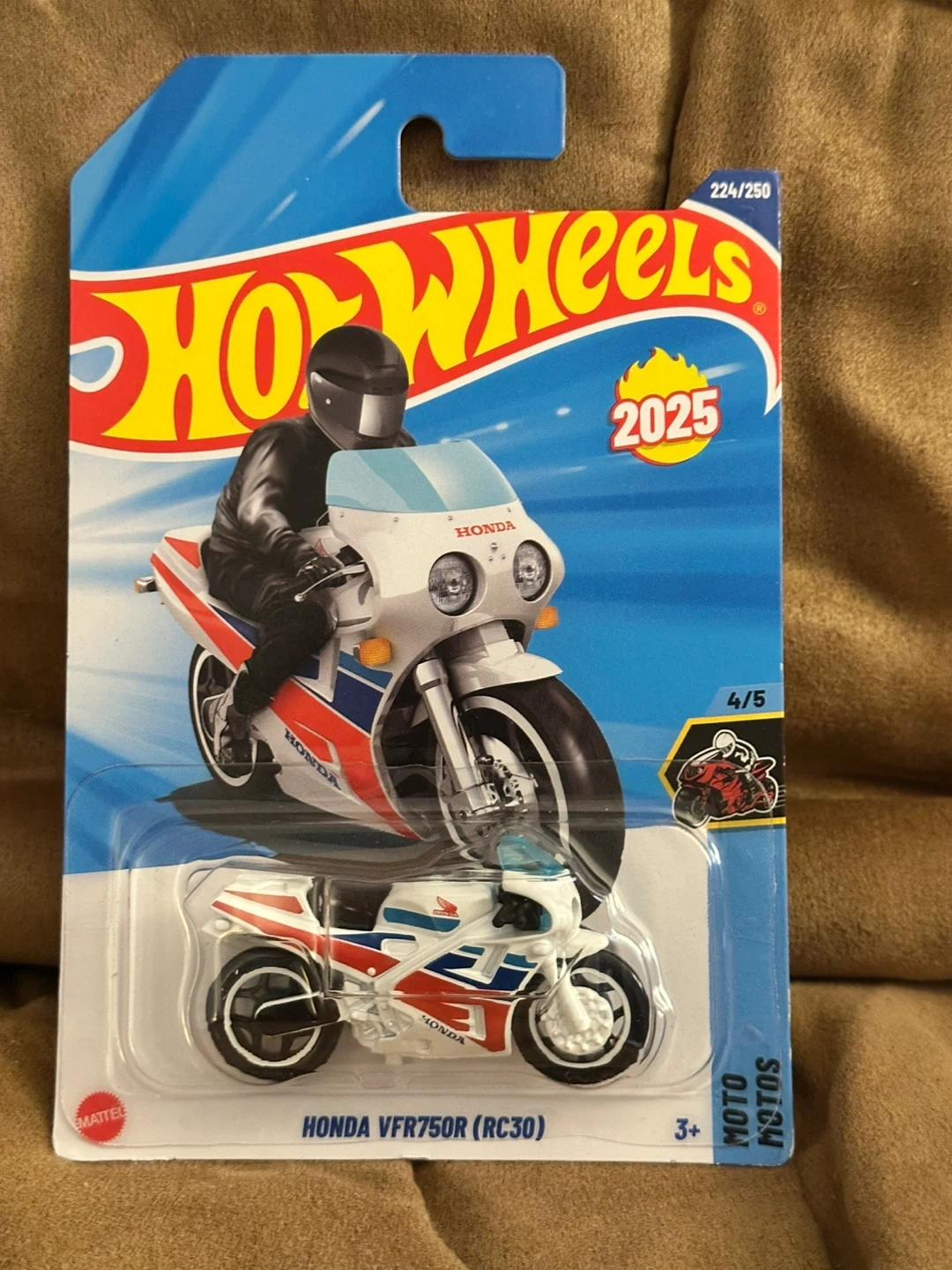 Collection of four Hot Wheels Honda motorcycles. Includes Honda CB750 Cafe, Honda Super Cub Custom, Honda Motocompo, and Honda VFR750R (RC30). All are new in packaging.