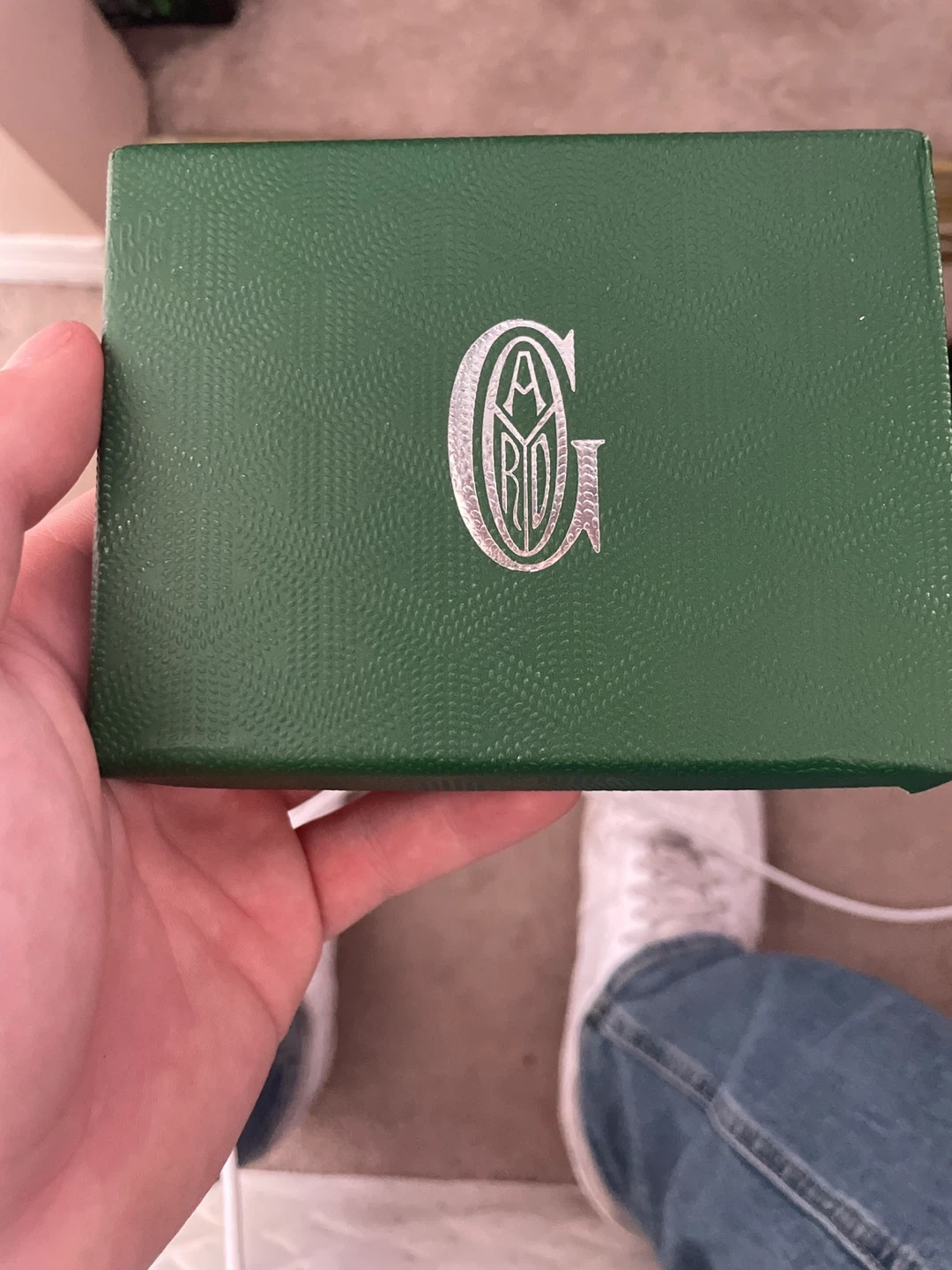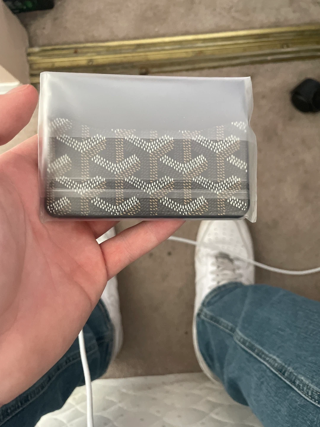 This is a Goyard card holder. It comes in a presentation box. The pattern is the iconic Goyardine print.