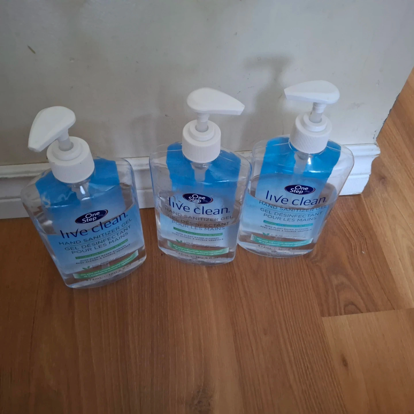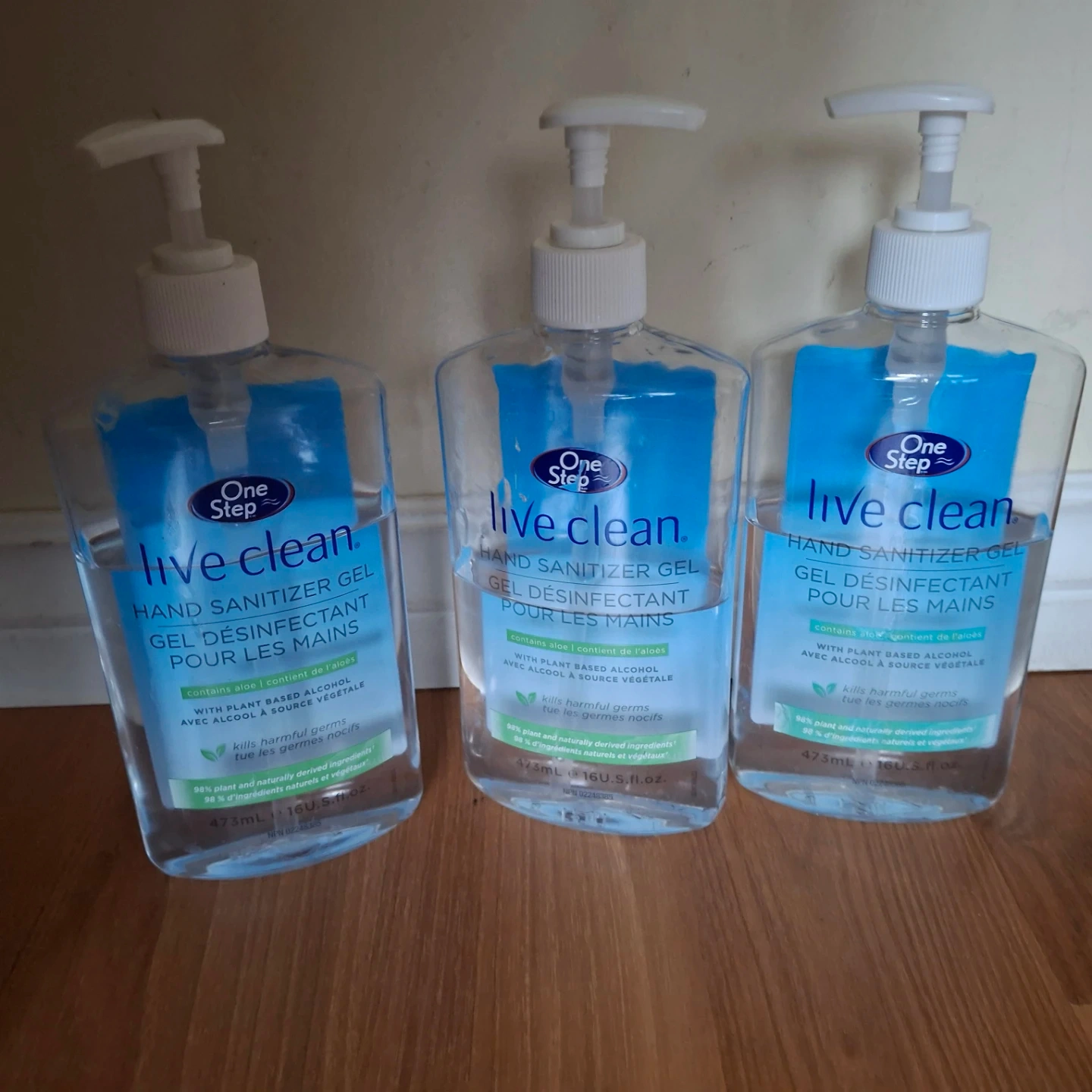 Three bottles of Live Clean hand sanitizer gel. Contains 65% plant-based alcohol. Kills harmful germs effectively. Each bottle is 473 mL