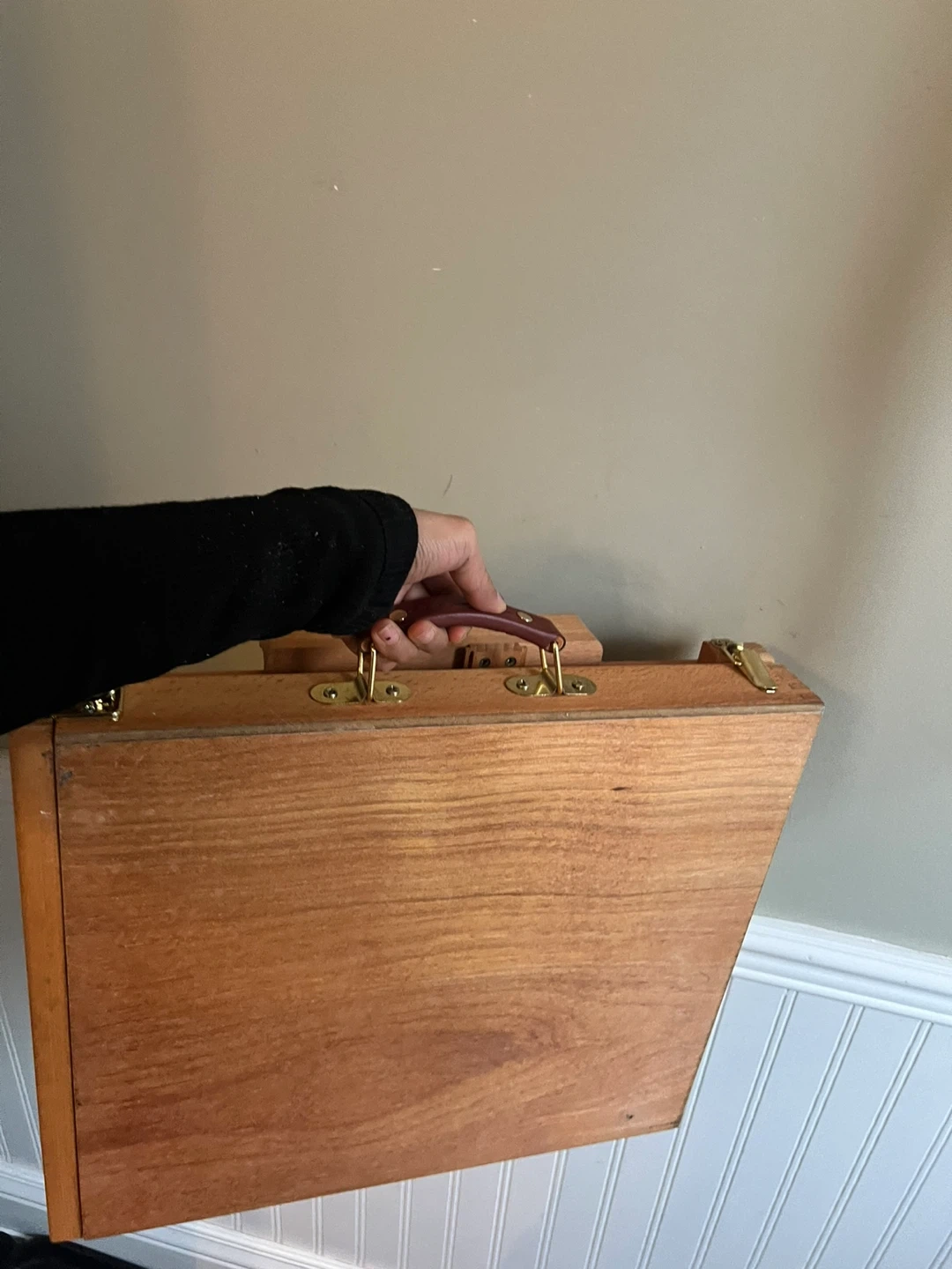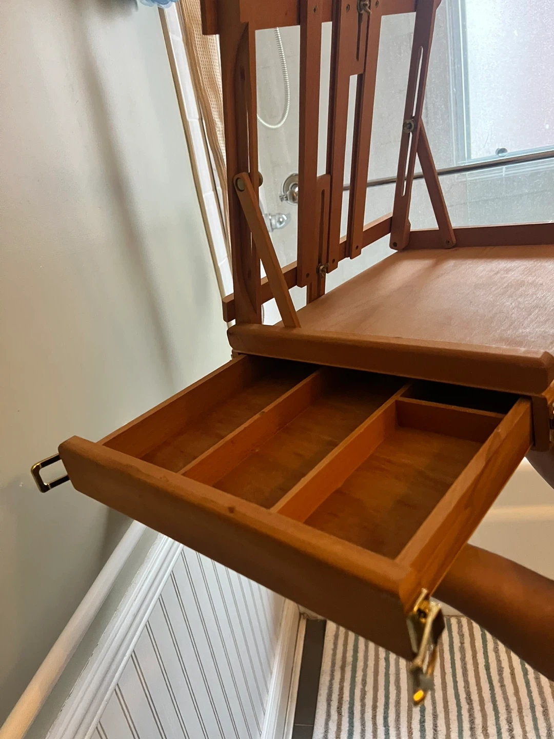 This wooden tabletop easel is portable and includes a storage drawer with dividers. It's made of durable wood, perfect for artists on the go. The easel is adjustable for various canvas sizes.