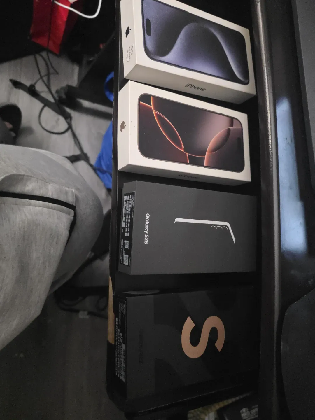 Two iPhones { 15 pro max blue and 16 pro} and two Samsung Galaxy (S22 and s25 series) boxes with manuals included.in their original packaging