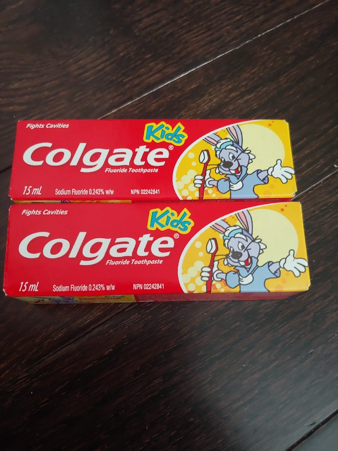 two boxes of Colgate Kids Fluoride Toothpaste! Each box contains 15ml of toothpaste.