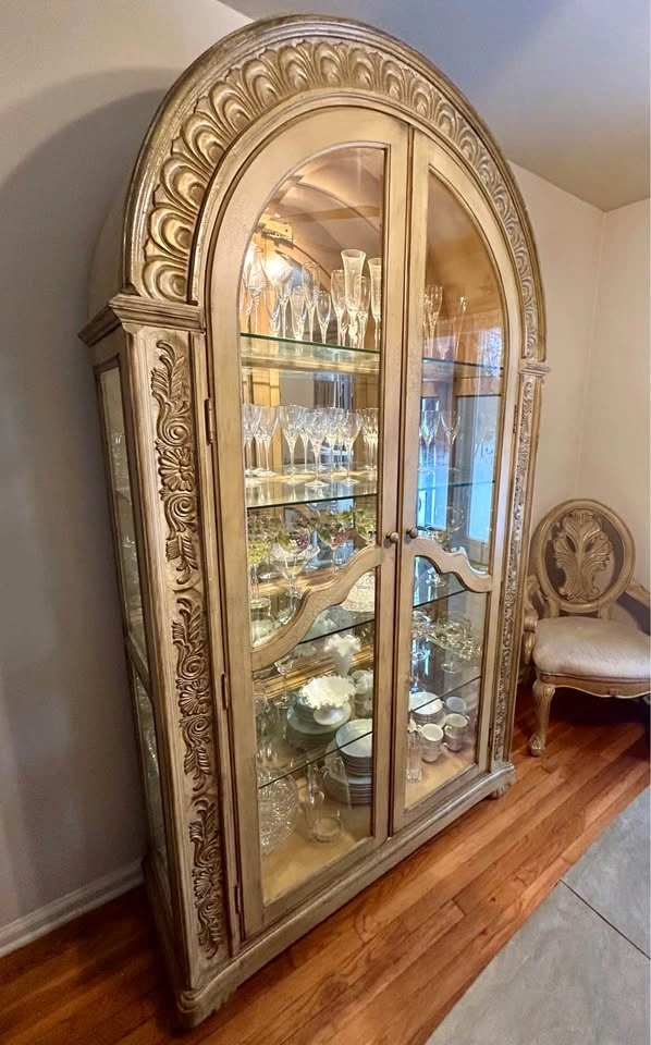 Beautifully detailed with ornate carvings. Features glass doors, four glass shelves, and a mirrored back panel. Elegant arched top and internal lighting. This is a beautiful piece to showcase fine china, stemware, or any collection.