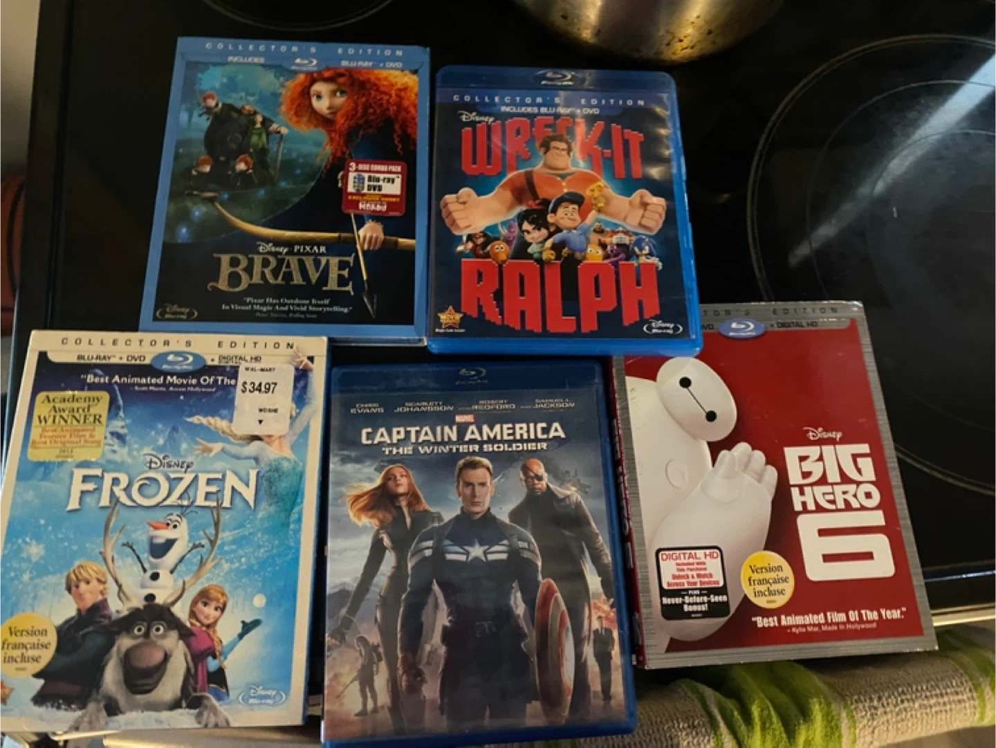This lot includes Disney's Brave, Wreck-It Ralph, Frozen, Captain America: The Winter Soldier, and Big Hero 6 collector's edition Blu-ray and DVD combo packs. They are digital HD compatible and some include French versions.