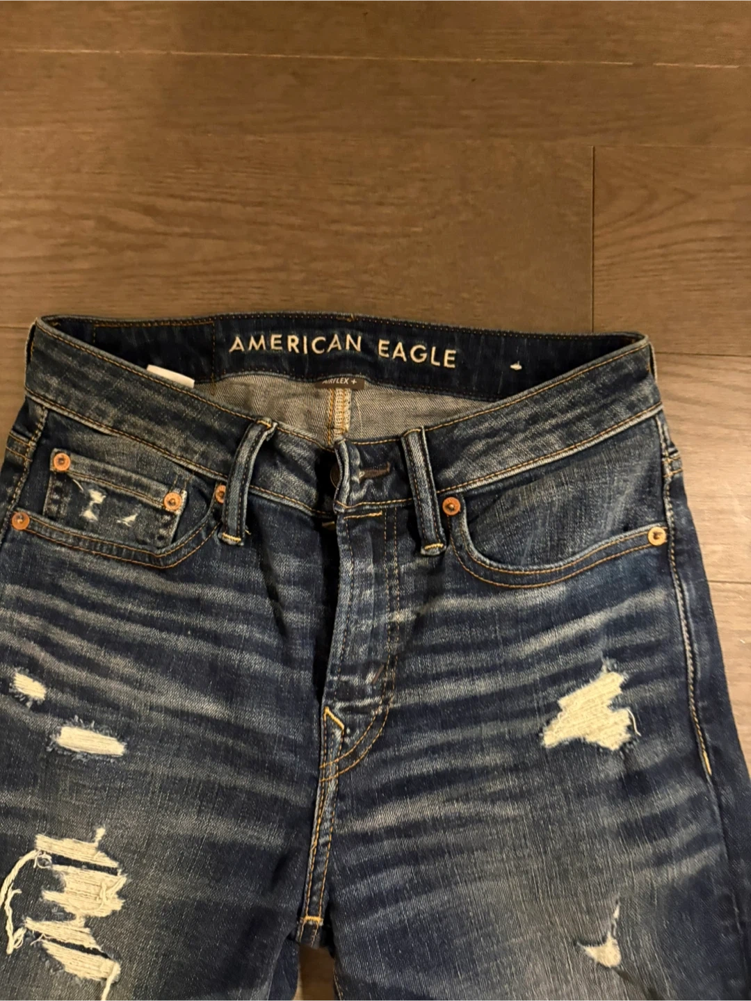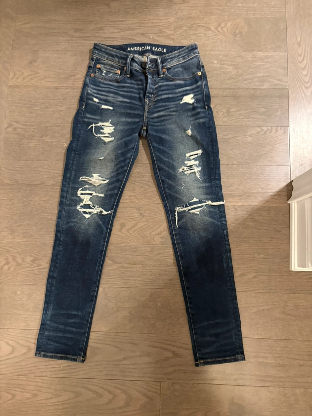 Blue distressed jeans from American Eagle. Denim material. These jeans have a unique distressed look with rips and fading.