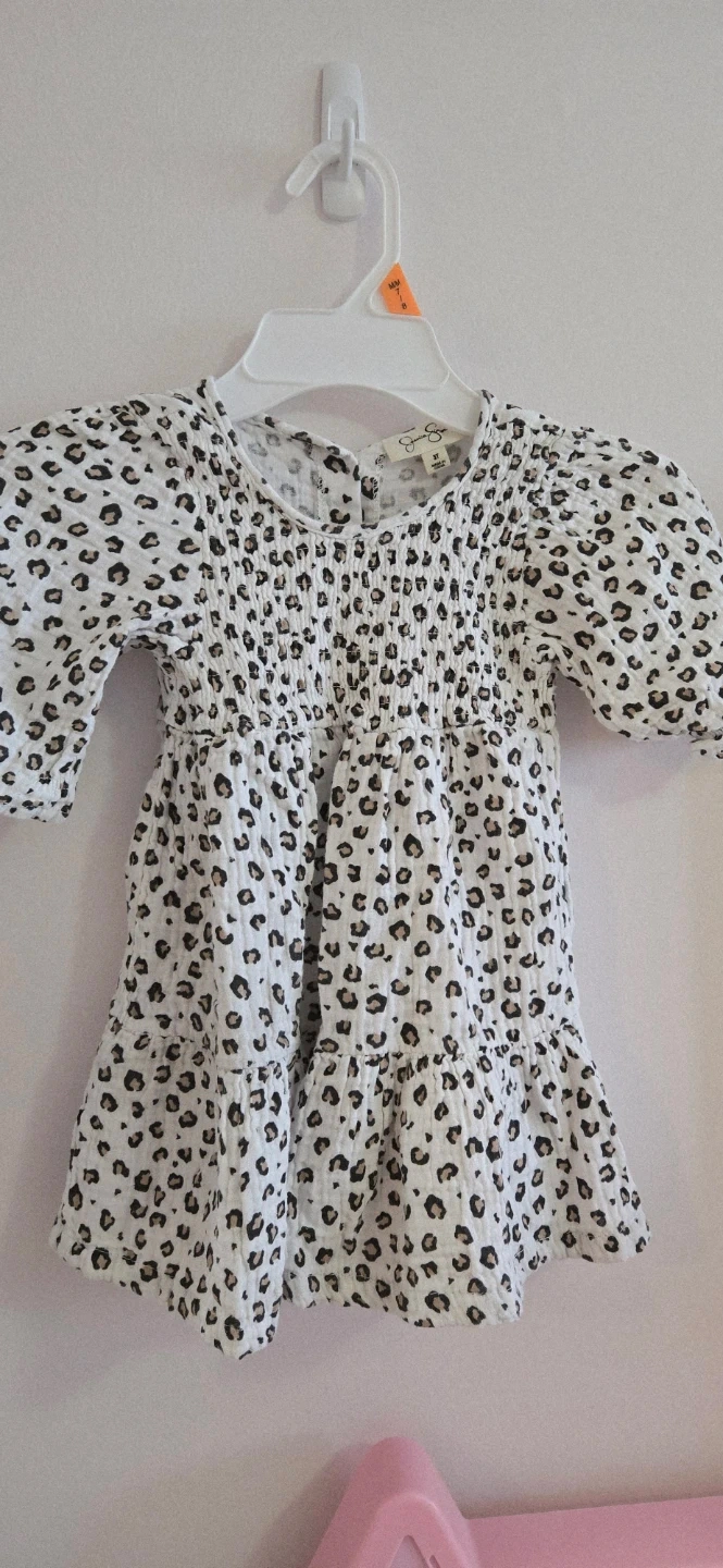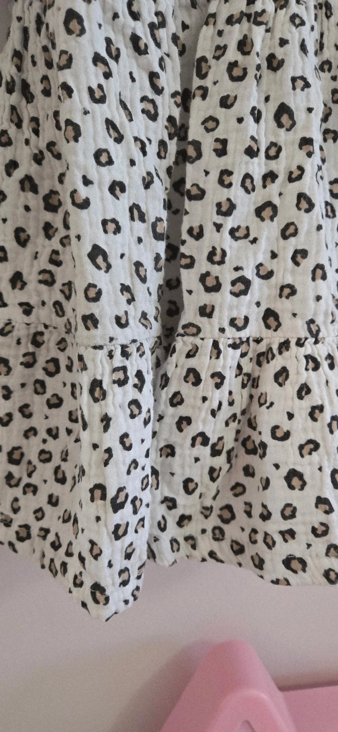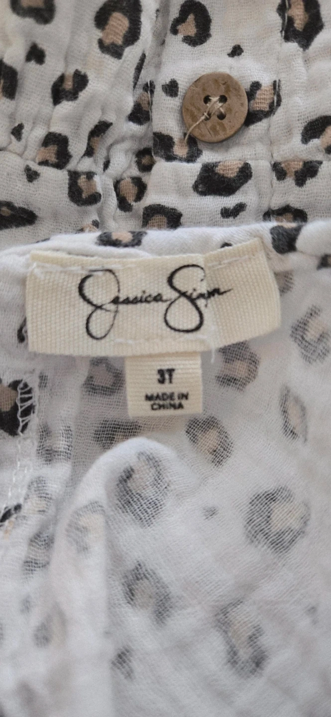 White gauze dress with a black and tan leopard print. 3t.Features a smocked bodice and button front with wooden buttons. Ruffled hemline. Lightweight and breathable fabric.