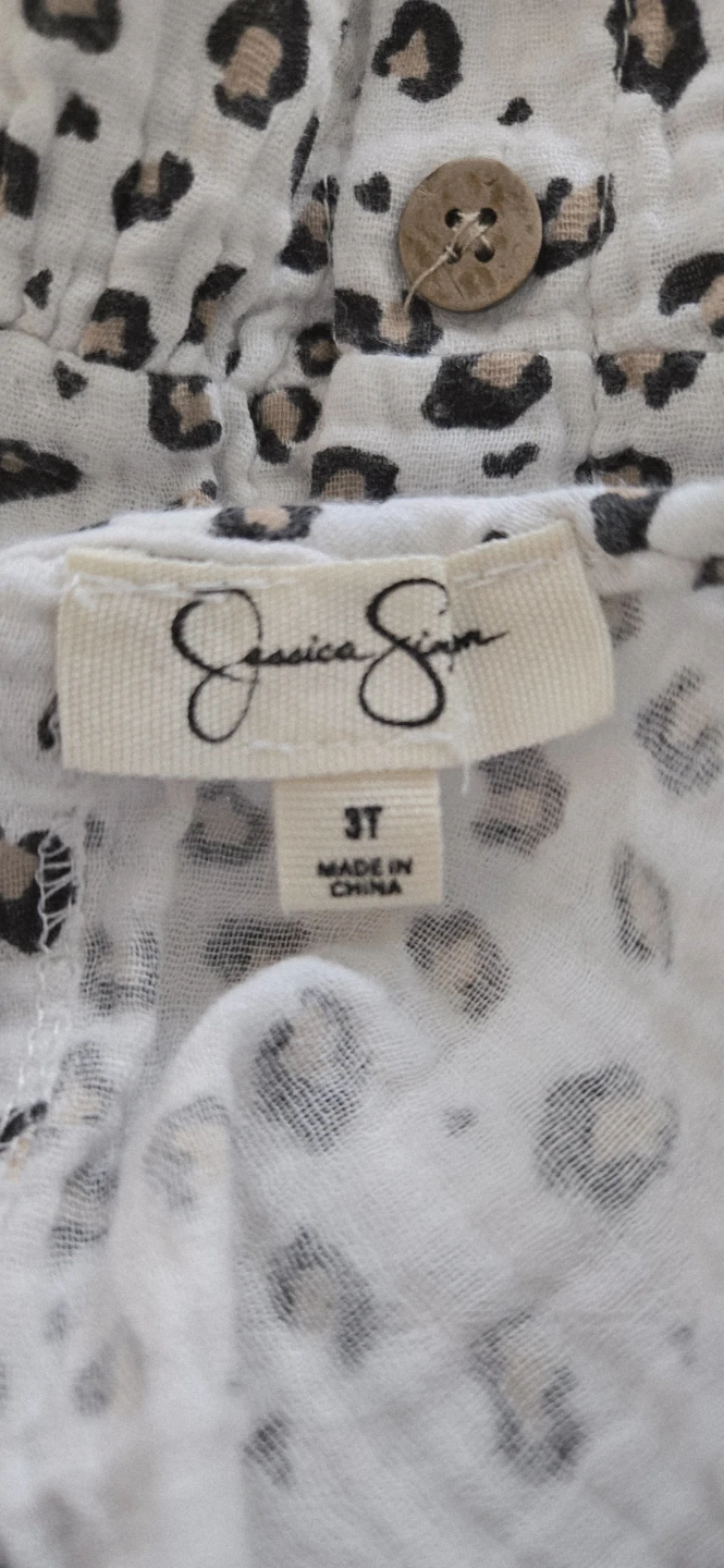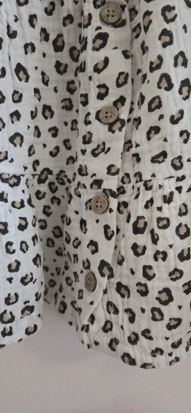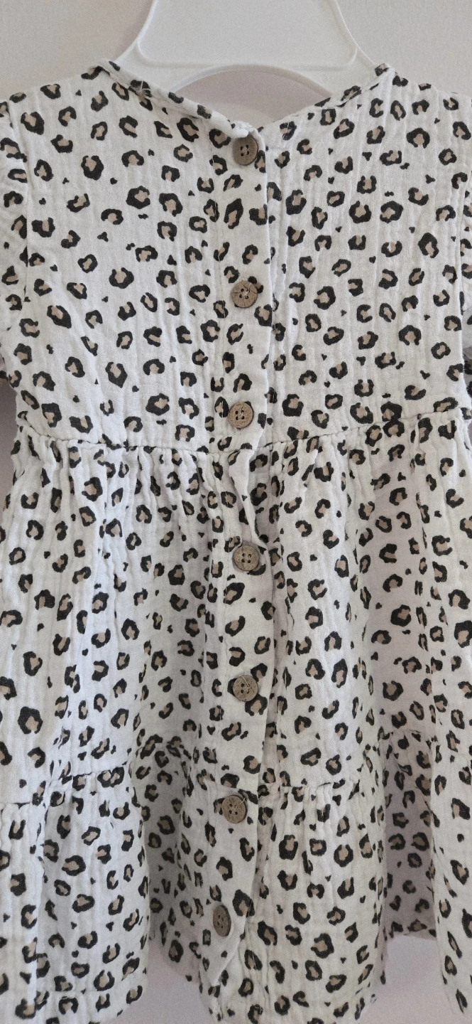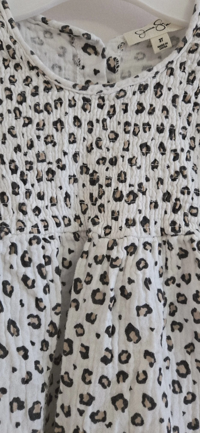 White gauze dress with a black and tan leopard print. 3t.Features a smocked bodice and button front with wooden buttons. Ruffled hemline. Lightweight and breathable fabric.