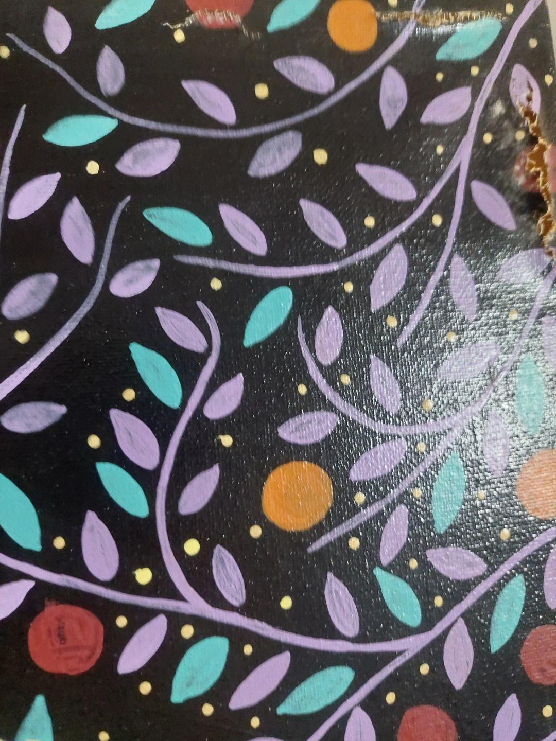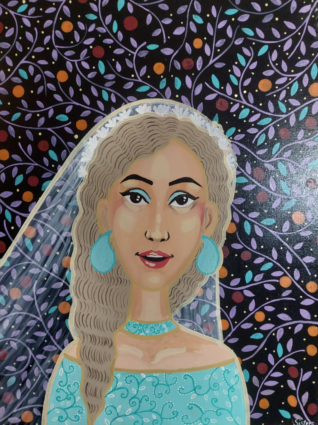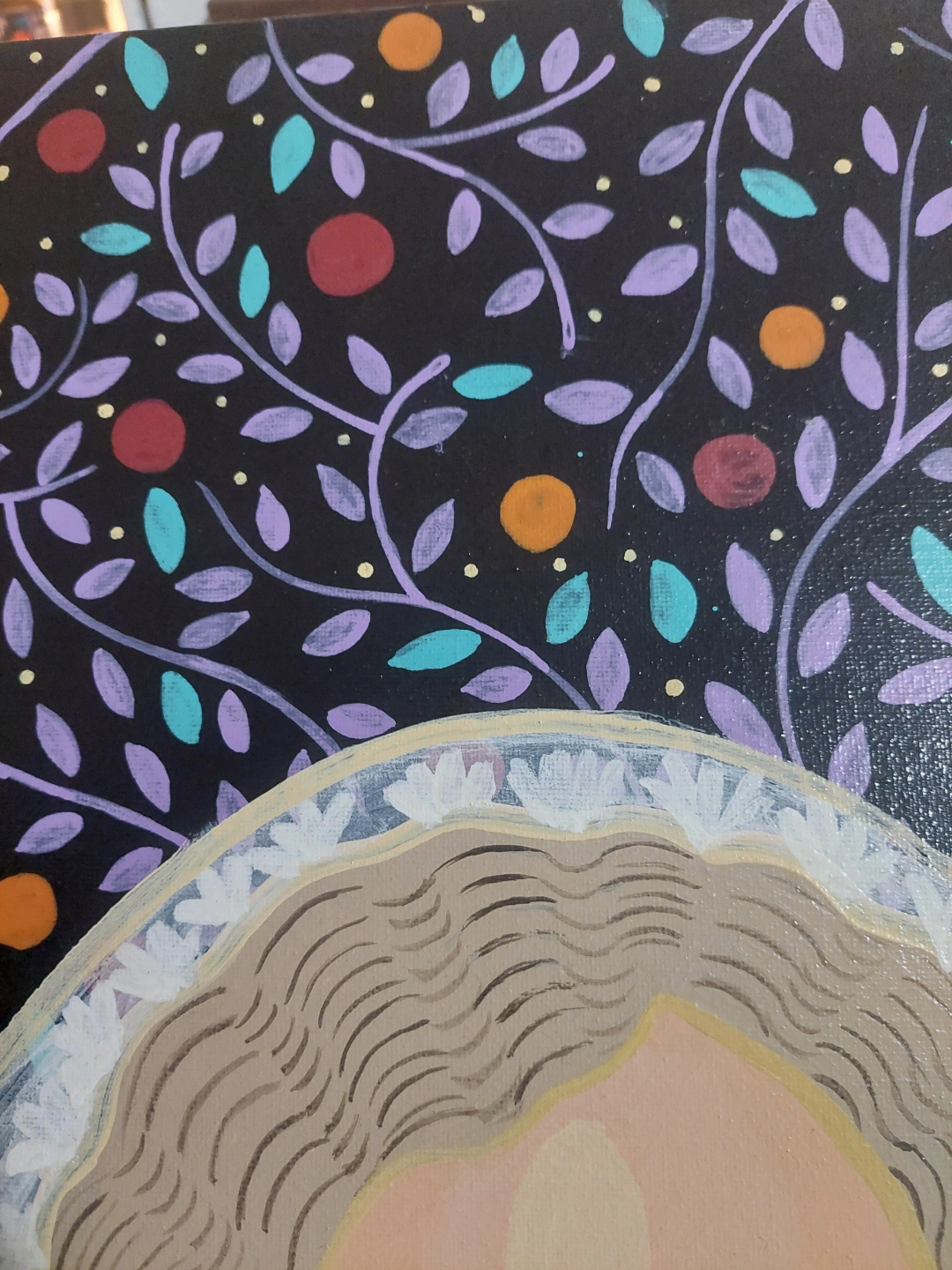 A hand-painted portrait, featuring a woman. Decorated with colourful patterns in the background.