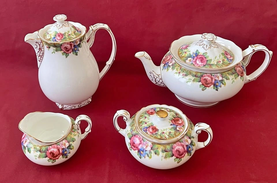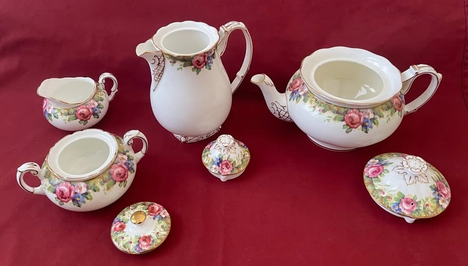 Extremely rare, Double Warrant Backstamped (1937-1952) set. All pieces are in perfect condition with no chips or cracks. The set includes: Creamer, Sugar (with lid), Teapot (with lid) - extremely rare, Coffee/Cocoa pot (with lid) - extremely rare. Let me know if you're interested!