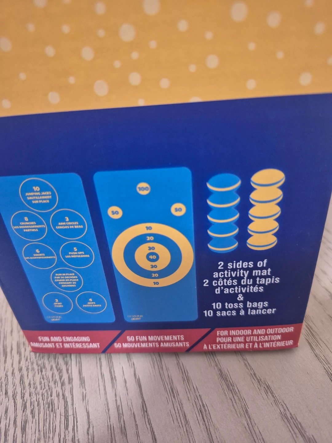 This activity mat has two sides for different games and includes 10 toss bags. It's designed for indoor and outdoor use for kids aged 5 and up. Great for active play!